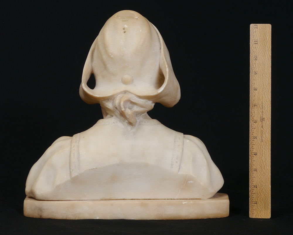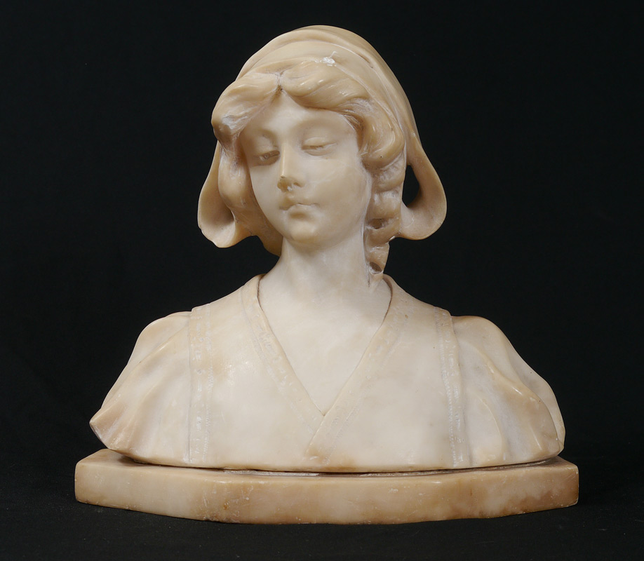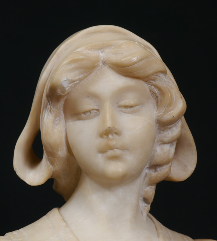 ALABASTER BUST OF A YOUNG MAIDEN: 11 1/2'' h., affixed to a marble plinth, overall measurements 13'' h. x 14'' w. x 6'' d., no visible signature.
