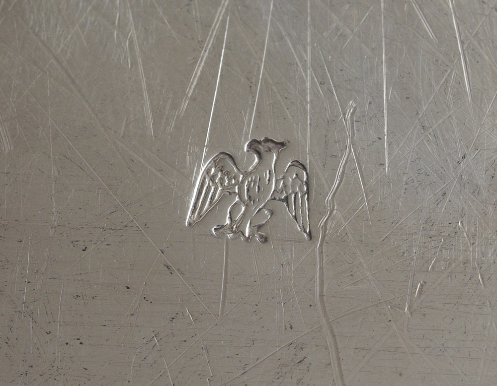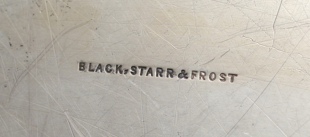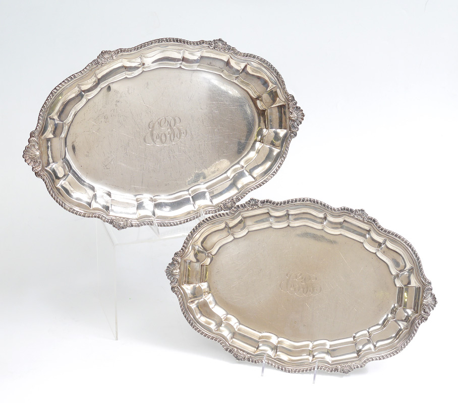 2 BLACK, STARR & FROST STERLING SERVICE PLATTERS: 2 platters each marked ''Black, Starr & Frost Sterling 1296 (one) 18 IN (the other) 20 IN'' and with bird stamp. Both monogrammed, larger of the 2 measures 21 1/2'' x 13 3/4'' overall, approx. 104.5 troy oz. total. Estate of Elton Hoyt II