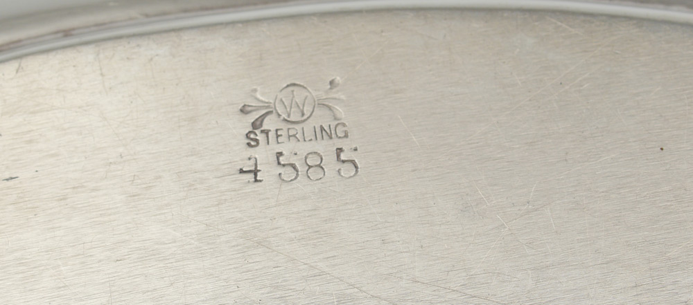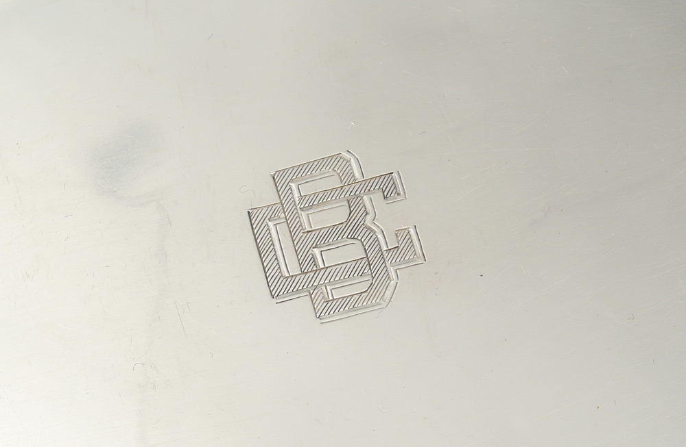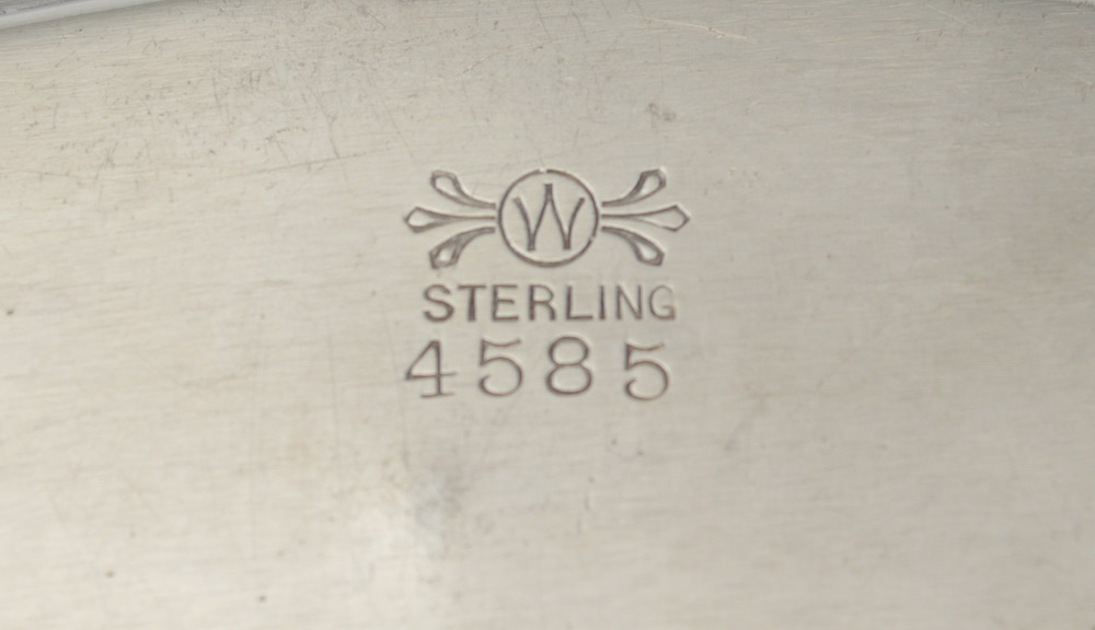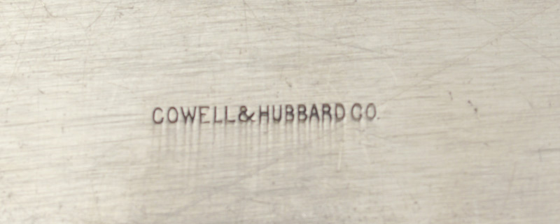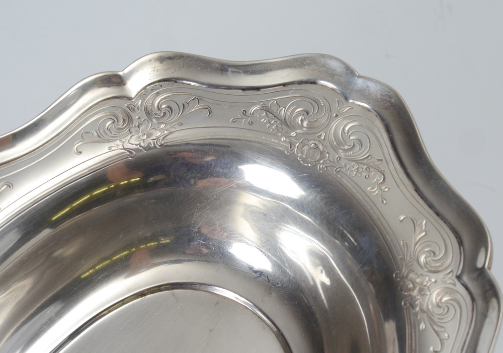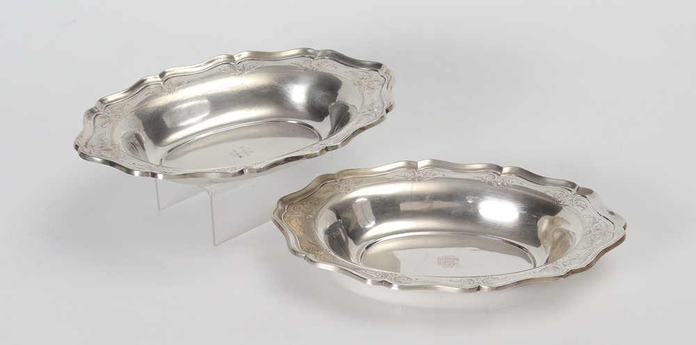 PR WHITING STERLING OPEN VEGETABLE BOWLS: Shaped rim with foliate engraving, monogrammed. Marked on base with Frank M. Whiting hallmark, 4585, retailer name Cowell & Hubbard Co., monogrammed. Overall measure 1 5/8'' x 11'' x 7 5/8''. Approx. 21.2 troy oz. Estate of Elton Hoyt II
