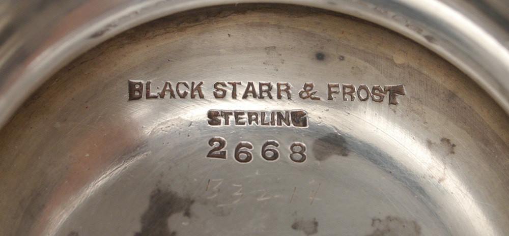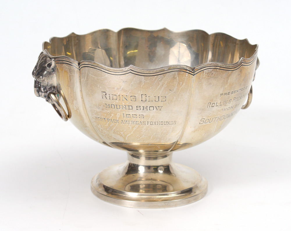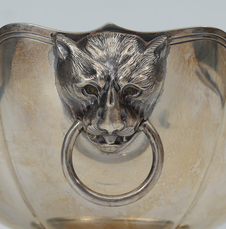 1929 STERLING SILVER FOX HUNT TROPHY: Made by Tuttle Silversmiths and retailed by Black, Starr & Frost, scalloped rim, figural cat head handles. Engraved presentation ''Riding Club Hound Show, 1929, Best Pack American Foxhounds'', and '' Presented by Rolling Hock Hunt, won by Southdown Hunt''. Overall measures 5 3/4'' h x 9 1/2'', approx. 31.2 troy oz.. Estate of Elton Hoyt II