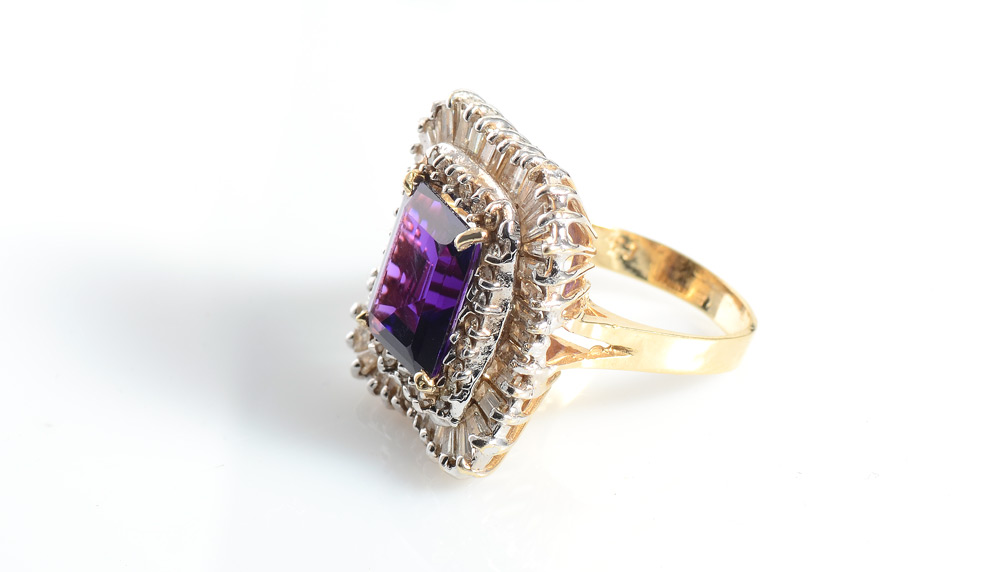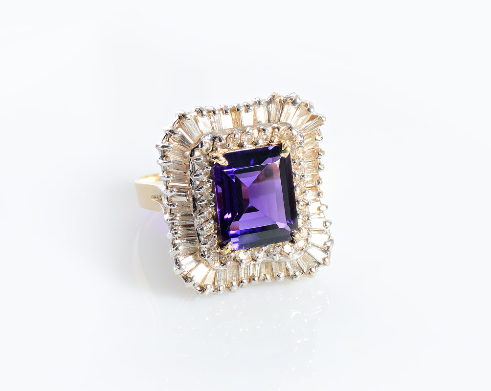 AMETHYST & DIAMOND DINNER RING: 14K yellow gold ring centering one emerald cut approx 5 Ct amethyst framed in a wave of round full cut and baguette cut diamonds totaling approx. 1.85 Ct. Rated SI-I1 in clarity and I-J in color. The amethyst and diamonds are prong set. Weight: 10.9 grams. Size: 7