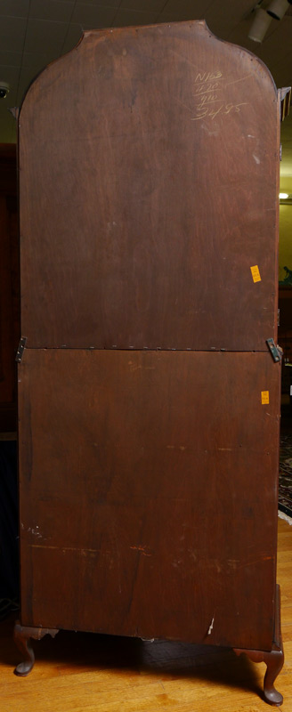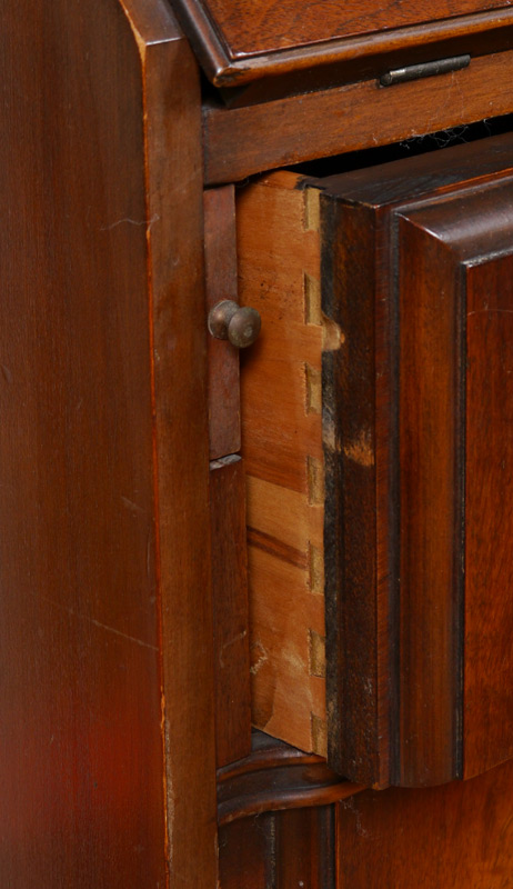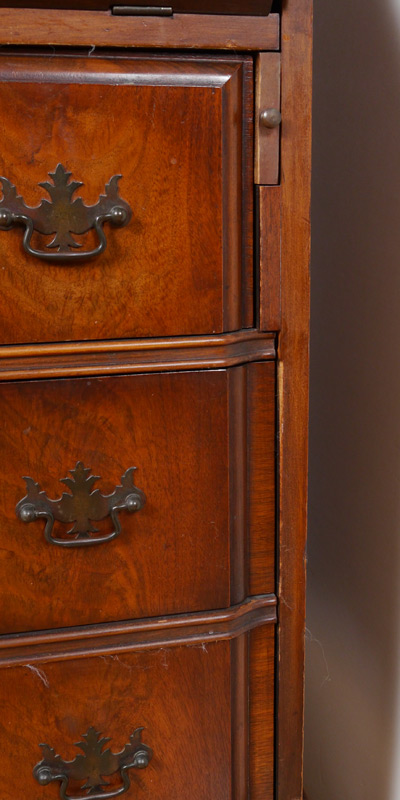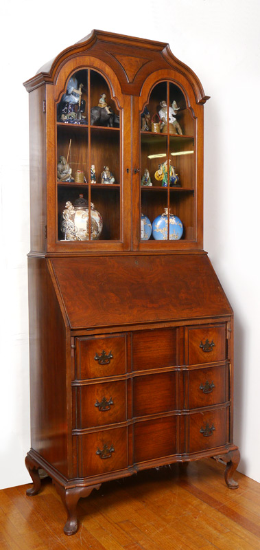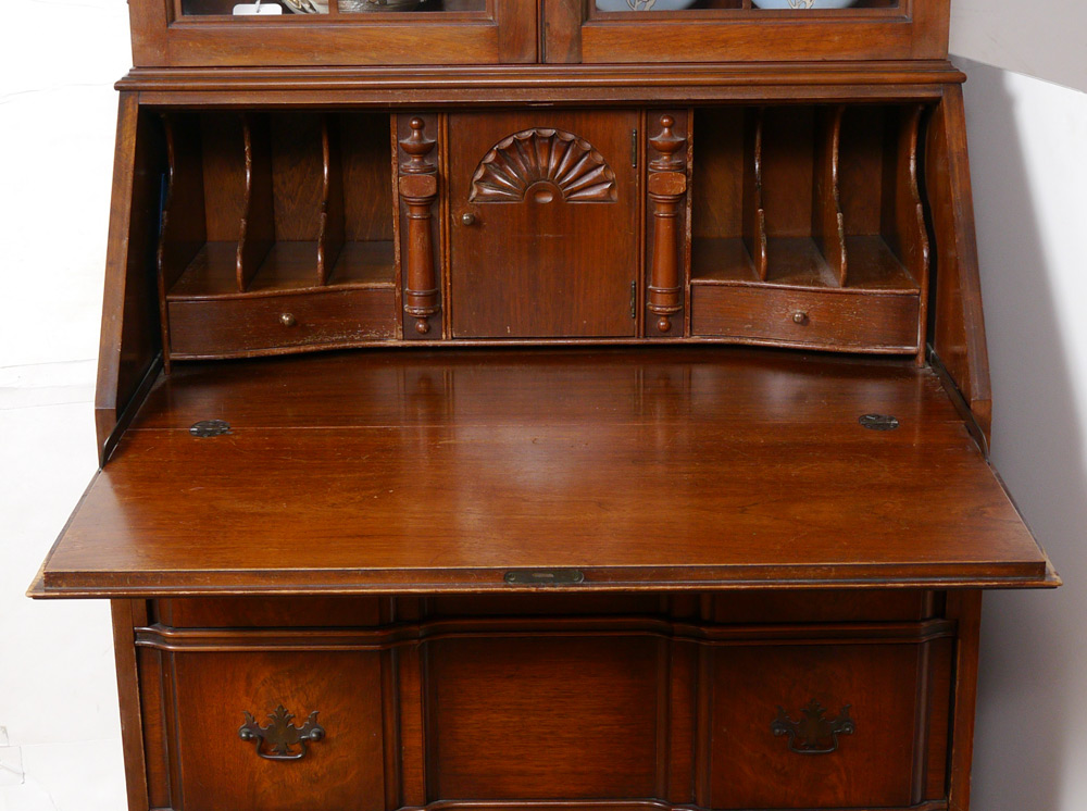 DROP FRONT SECRETARY DESK: Early to mid 20th century, shaped crest with applied decoration. 2 glass door bookcase top with fretwork, 2 shelves. Fall front secretary base with mechanical slides, interior with carved door, 2 drawers, pigeon holes and secret compartment. 3 full length drawers, on shaped legs with pad feet. Overall 76 1/4'' h. x 32 1/2'' x 17 1/2''.