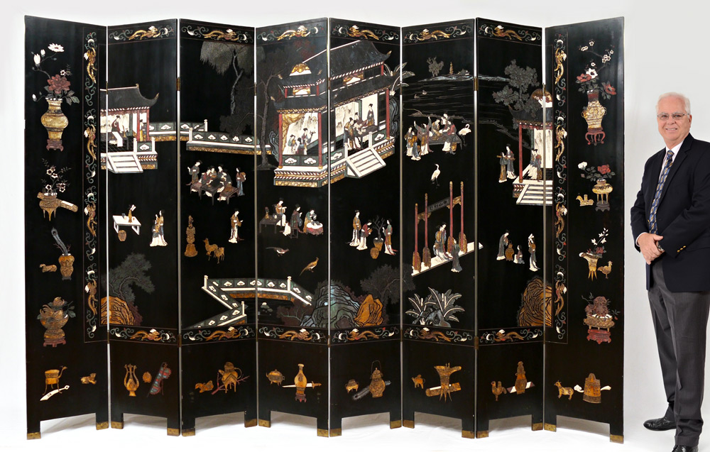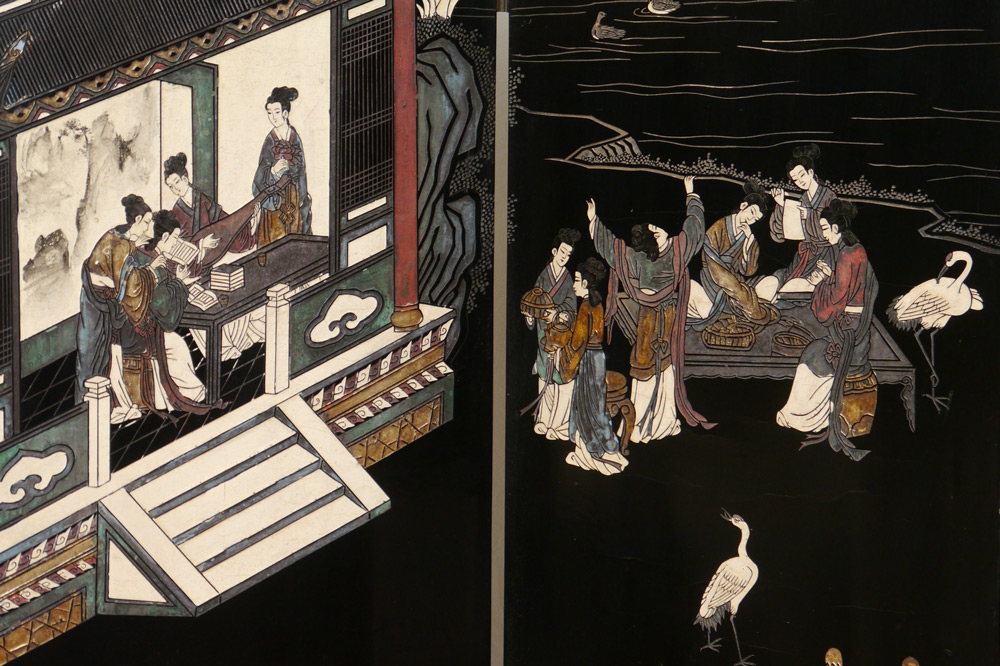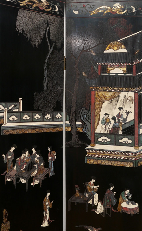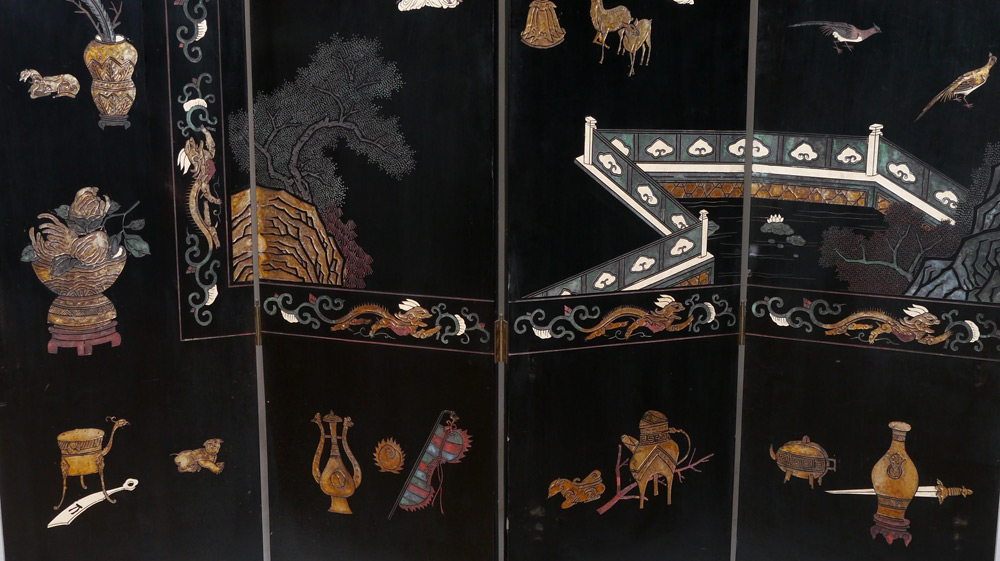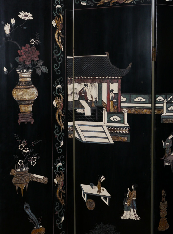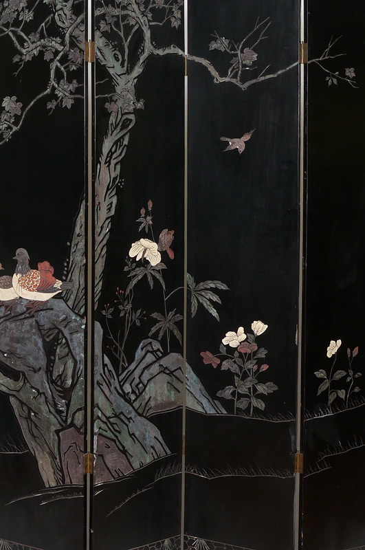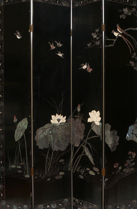 EARLY LARGE 8 PANEL COROMANDEL SCREEN: Black lacquer ground with carved polychrome decoration of outdoor village genre scene bordered by oriental items on one side, marshland bird and trees scene verso. Each panel 84'' x 15 3/4''.