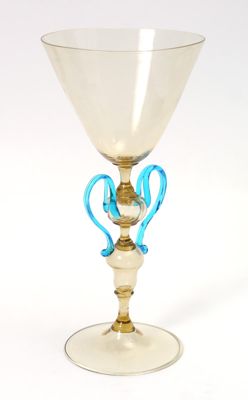 LARGE VENETIAN GLASS GOBLET: Amber glass with applied blue handles, unmarked. Measures 13 1/2'' h. x 5''.
