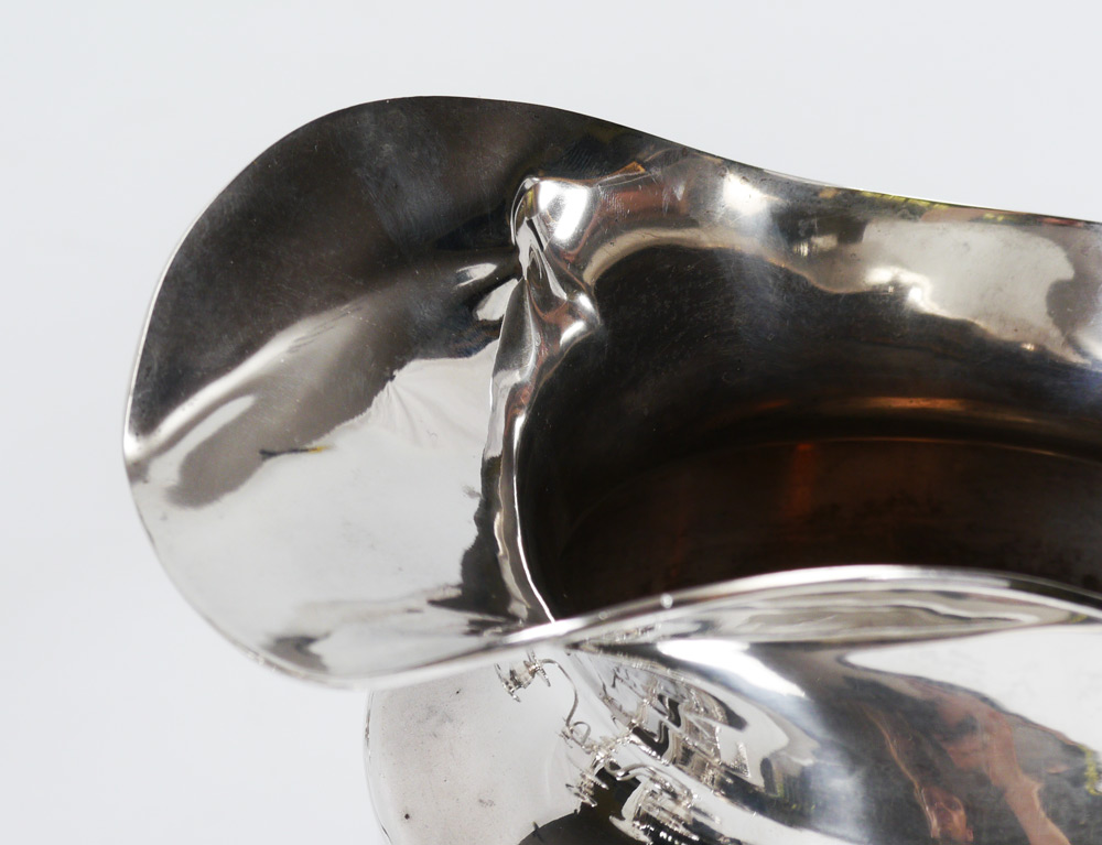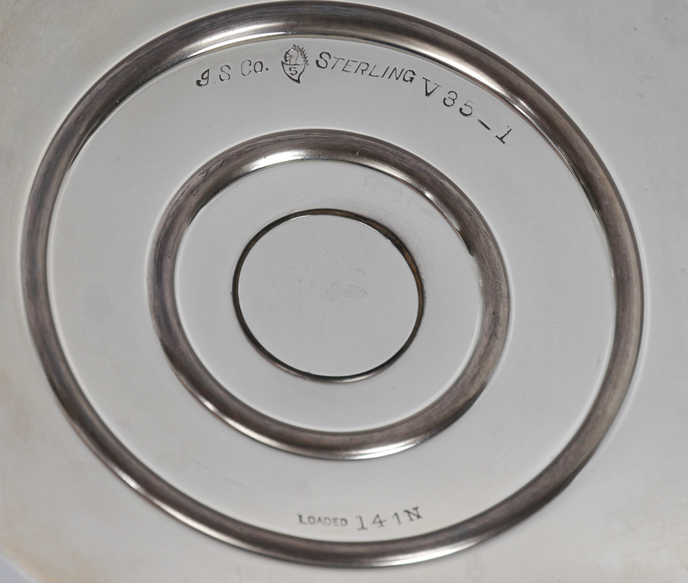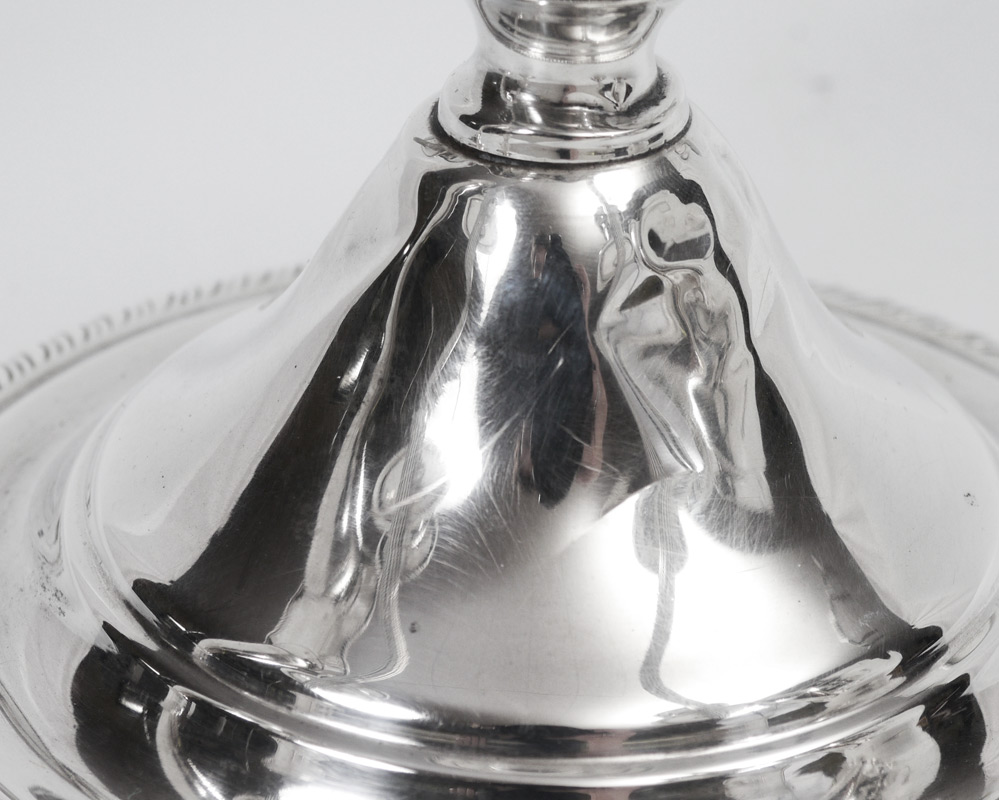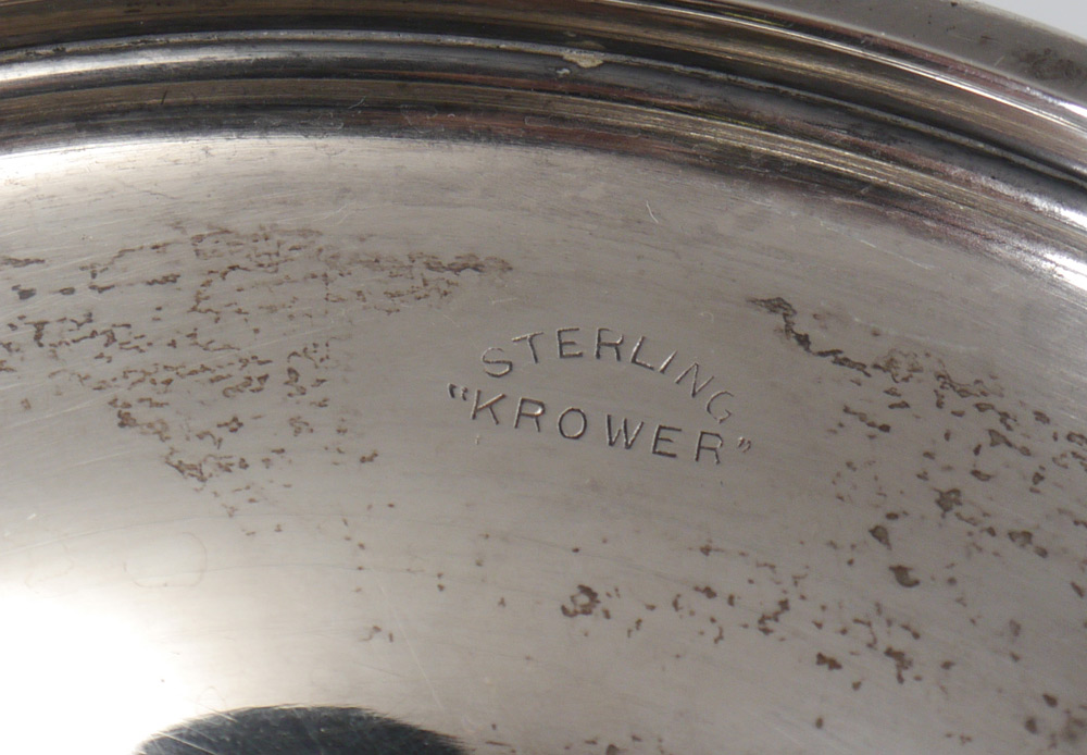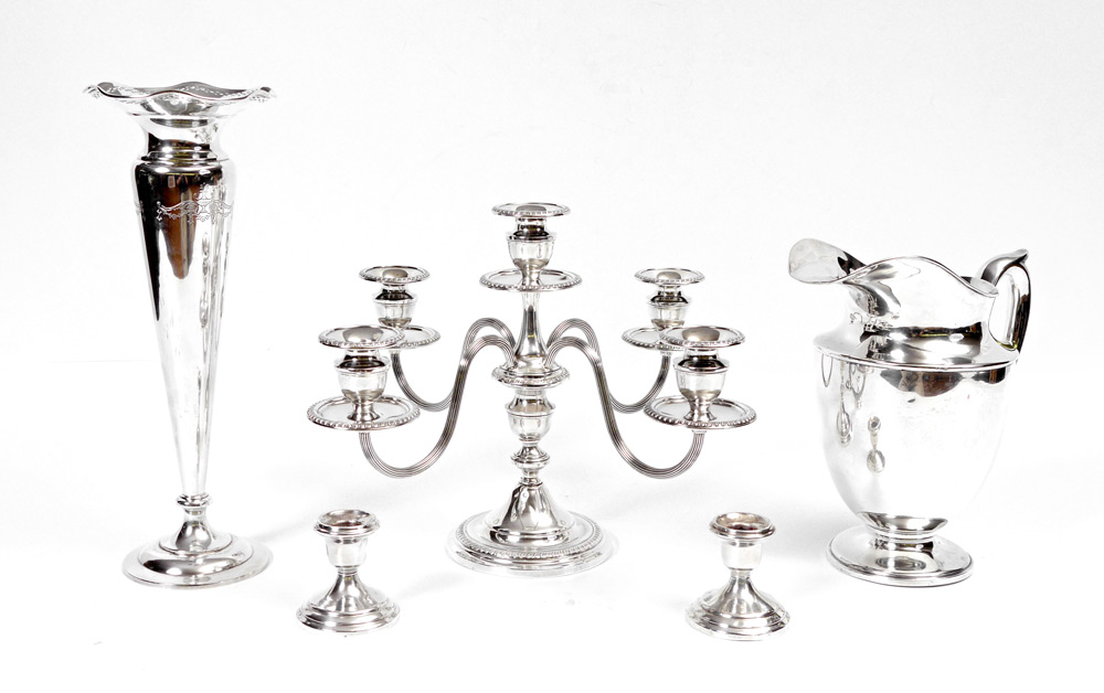 ESTATE COLLECTION OF STERLING SILVER ITEMS: 5 assorted pieces to include 1) Water pitcher marked ''Krower'' Sterling, 414. 9 5/8'' h. x 9''. Approx. 22.5 troy oz. 2) Mueck-Carey 5 light weighted candelabrum, convertible to single light. Overall 10 1/2'' h. x 16 1/2''. 3) International Sterling weighted trumpet vase with reticulated scalloped rim, engraved design. 14'' h. x 5 1/4''. 4-5) Revere weighted sterling single candle stands, 2 7/8'' h. x 2 7/8''.