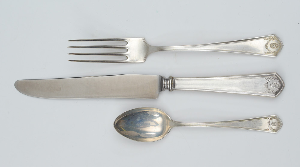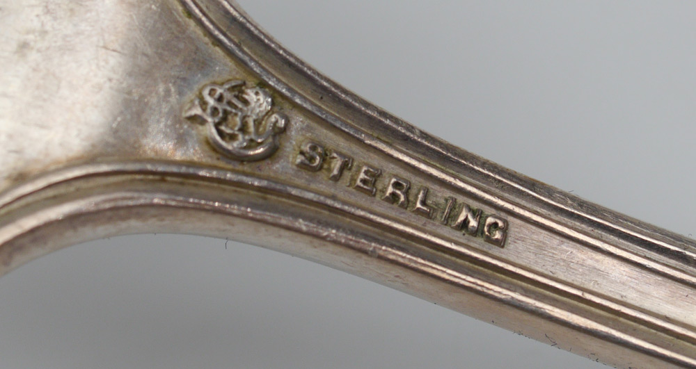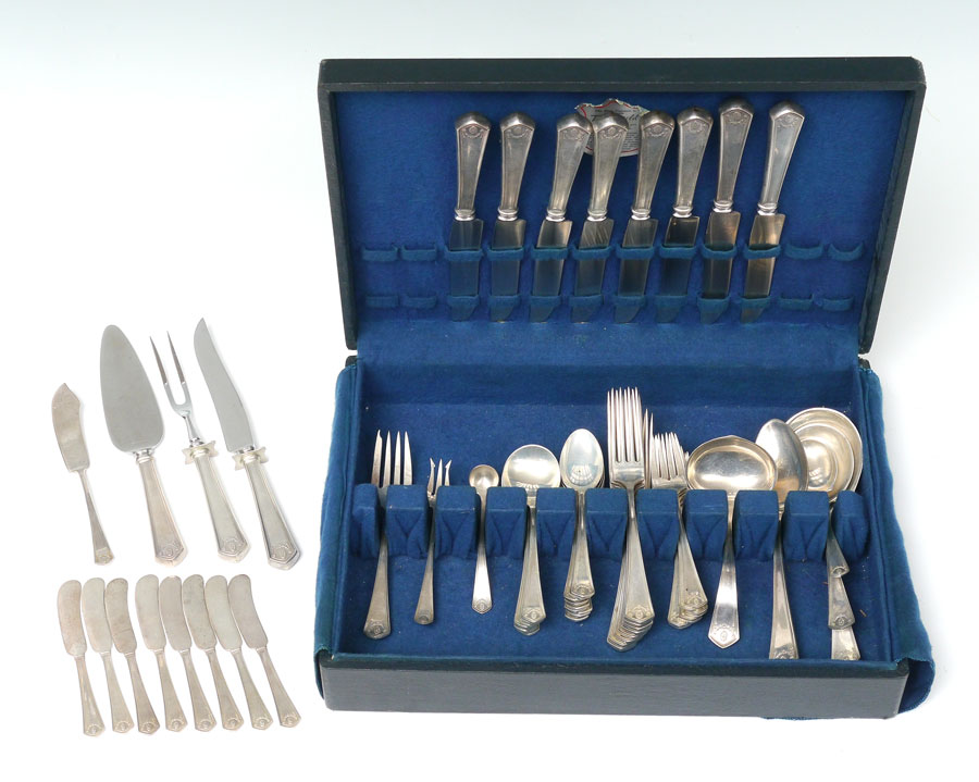 FRANK SMITH GEORGIAN GARLAND STERLING FLATWARE: Approx. 62 pieces in the Georgia Garland pattern by Frank Smith to include 8 forks (7 1/2''), 8 salad forks (5 3/4''), 9 teaspoons (6''), 8 soup spoons (6''), 8 hollow knives (9 3/4''), 8 solid butter knives (5 1/2''), solid master butter knife (6 7/8''), 2 tablespoons (8 1/4''), serving fork (7''), ladle (6 1/2''), 3 piece graduating sugar servers (largest 8 3/8''), lemon fork (5 5/8''), small cream ladle (4 5/8''), hollow pie server (9 3/4''), 2 piece hollow carving set (fork 9'', knife 10''). Approx. 64.5 troy oz. Sold with silver chest, 3 1/4'' x 15 1/2'' x 11 1/4''.