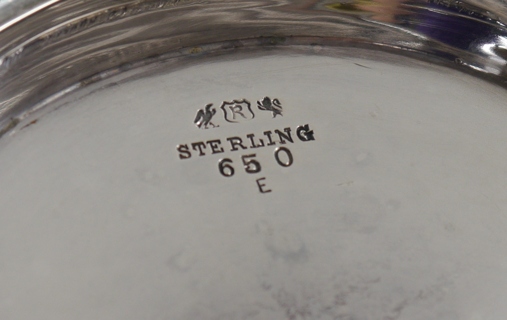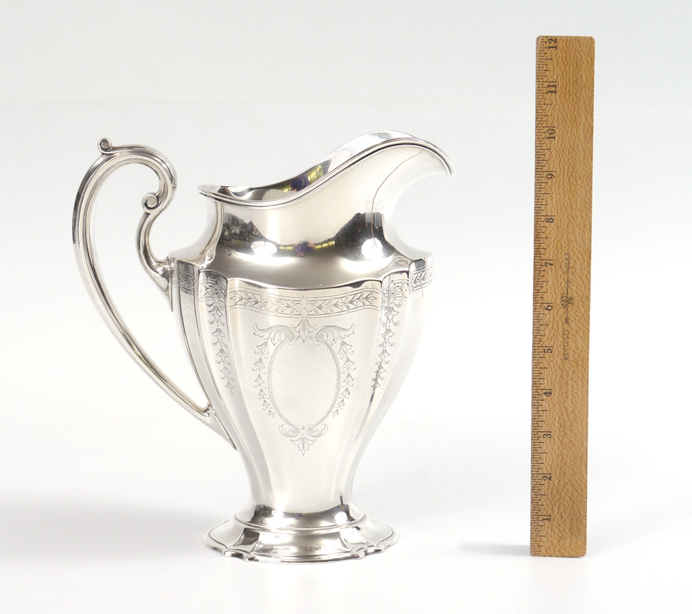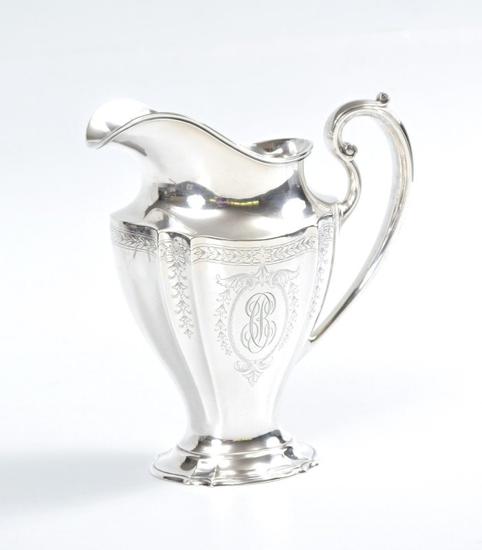 REED & BARTON STERLING SILVER WATER PITCHER: Fluted sides, engraved foliate motif, monogrammed. Marked on base with Reed & Barton hallmark, Sterling, 650, E. Measures 9 3/4'' h. x 9'', approx. 27.7 troy oz. From the estate of Elton Hoyt II.