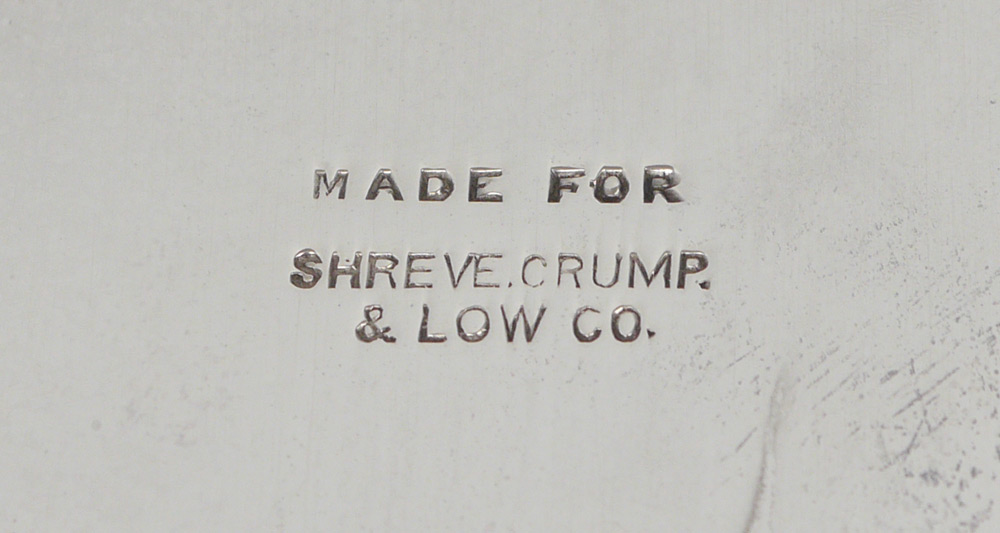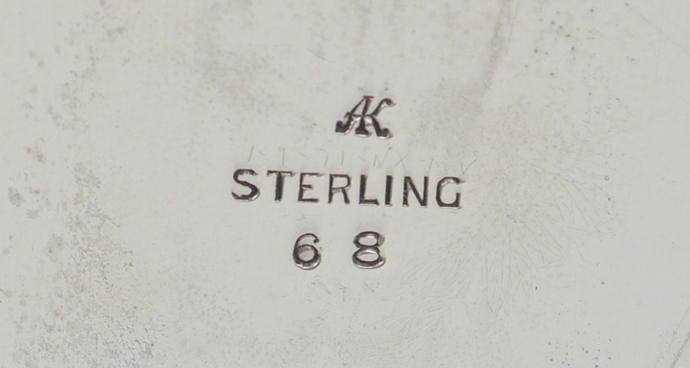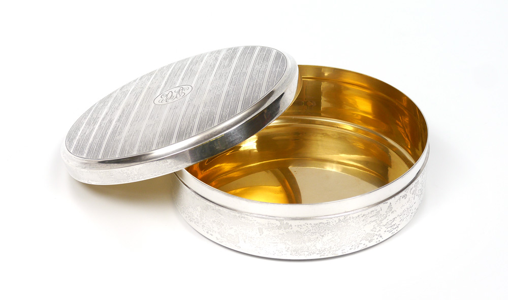 AHRENDT & KAUTZMAN STERLING SILVER COVERED BOX: Round box with engraved decoration and monogram on lid. Marked on base with hallmark for Ahrendt & Kautzman, Sterling, 68, Made for Shreve, Crump, & Low Co.. Measures 2 1/8'' h. x 6 3/4'', approx. 21.5 troy oz.