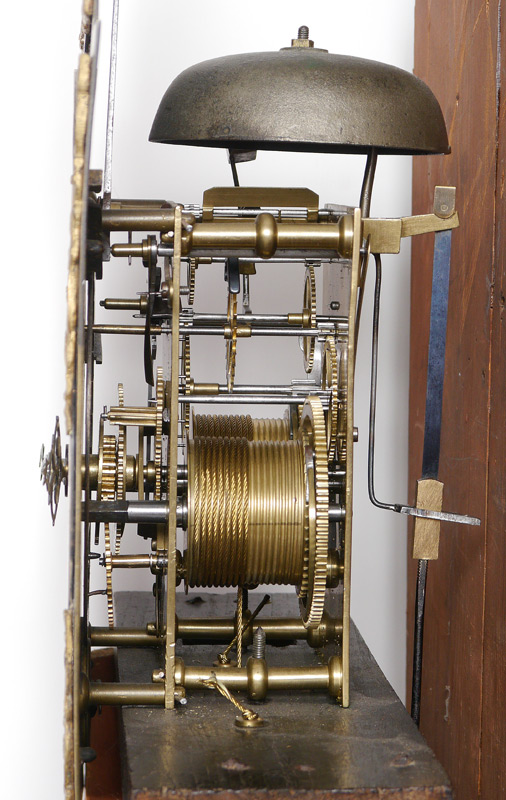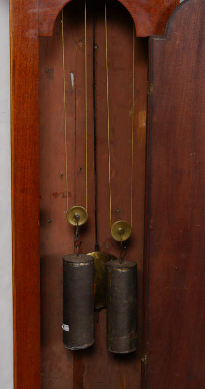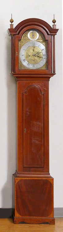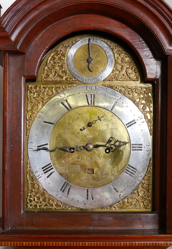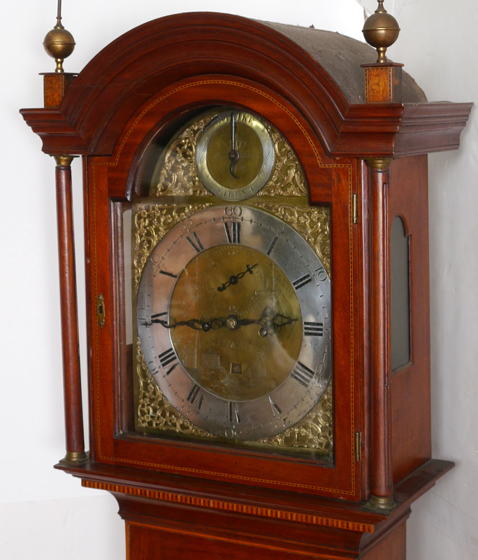 EDWARD RENOUF GEORGIAN TALL CASE CLOCK: Mahogany case with satin wood inlay, bonnet with arched pediment, brass spire finials, fluted full columns. Mixed metal dial with silvered chapter ring, Roman and Arabic numerals marked Edw. Renouf, Jersey. Secondary silent /strike, second, and date movements. Overall measures 83'' h. x 20 1/2'' x 9 1/2''.