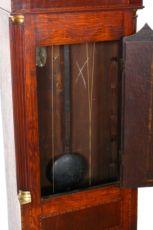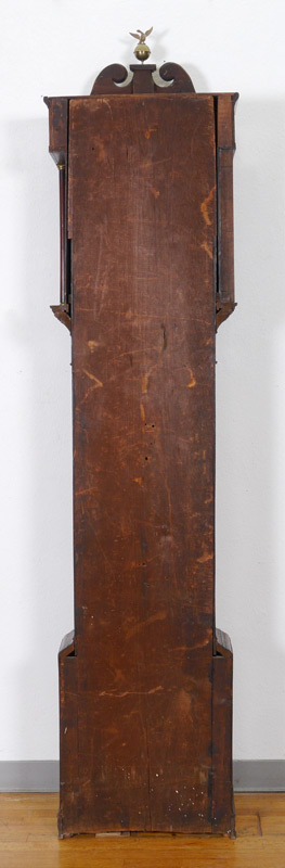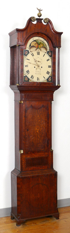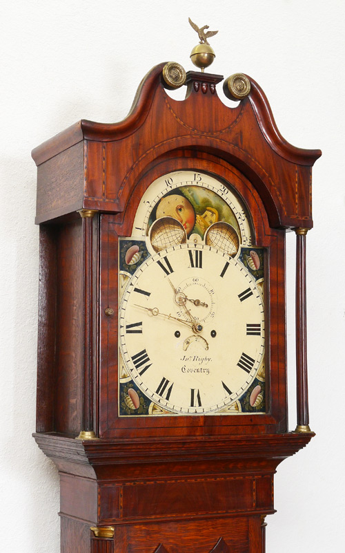 GEORGE III JOHN RIGBY TALL CASE CLOCK: Bonnet with broken arch pediment, brass eagle over ball finial, fluted full columns. Painted metal dial with sea shells at corners, Roman numeral and signed JNo Rigby, Coventry. Secondary moon phase, date and second movements. Mahogany case with banded inlay, door and base with marquetry inlaid sea shell in medallion, on bracket feet. Overall 93'' h. x 21 3/4'' x 10''.