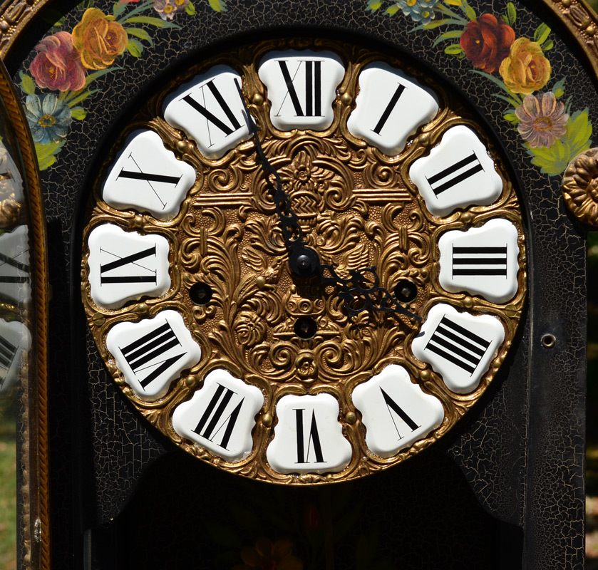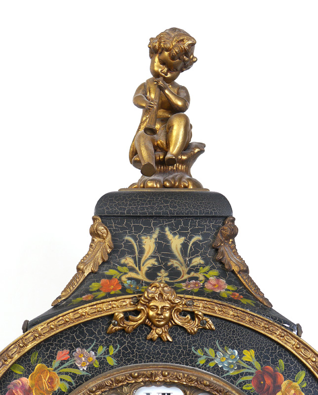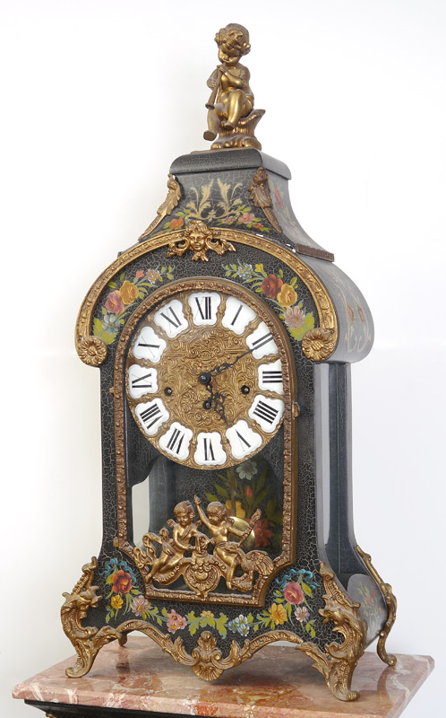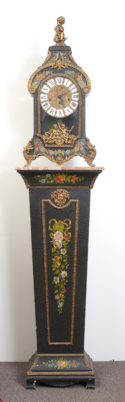 CONTINENTAL PAINT DECORATED MANTLE CLOCK & PEDESTAL: Contemporary mantle clock with cast metal figural putti playing a flute finial, floral paint decorated case with glass front and sides, cast gilt metal putti in front of door and decoration. Embossed dial with Roman numeral porcelain medallions, modern German time and strike movement. Measures 30'' h. x 14 1/2'' x 7''. Sold with matching marble top pedestal, 45 1/4'' h. x 17 1/4'' x 10 1/4''.