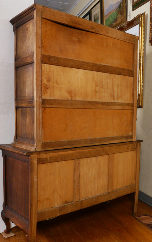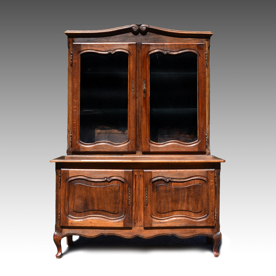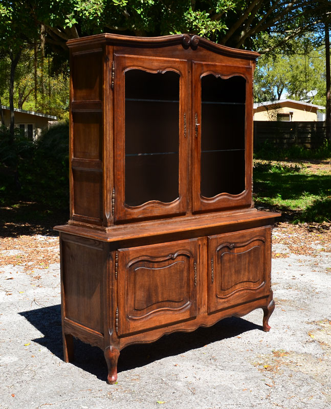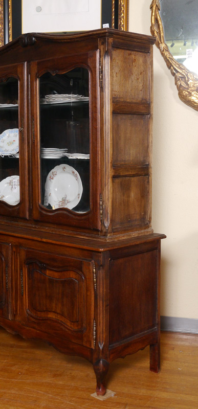 COUNTRY FRENCH CUPBOARD: Carved crest over 2 glass front doors with 2 interior glass shelves. Base with 2 doors, shaped front legs. Overall 71'' h. x 52 1/4'' x 13 3/4''.