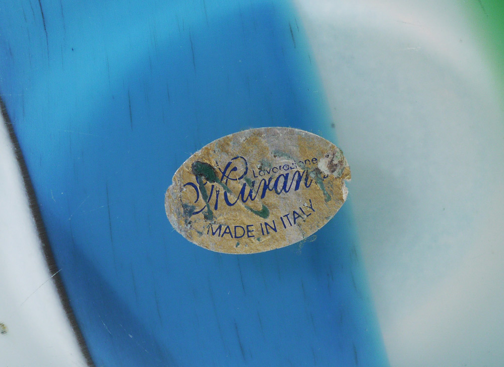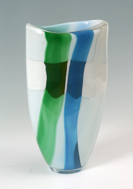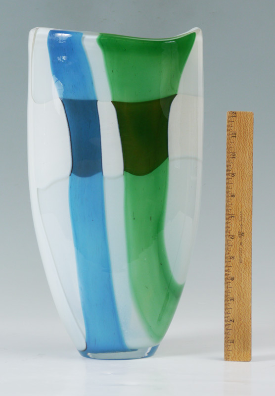 LARGE MURANO ART GLASS VASE: Free form rim, white glass body with white, blue and green accent ribbons. Original Murano foil label on base. 16 1/2'' h. x 8 1/2'' x 6 1/4''.