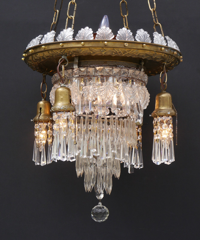 EMBOSSED BRASS CRYSTAL CHANDELIER: Floral motif brass canopy with crystal leaves above and below, 5 tiers of crystal drops and prisms, central faceted ball drop. 4 electric lights with prisms. Embossed ceiling cap. Overall measures 19 1/2'' h. x 18 1/2'' excluding cap and chain.