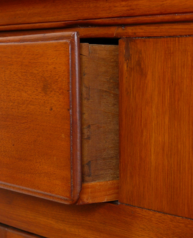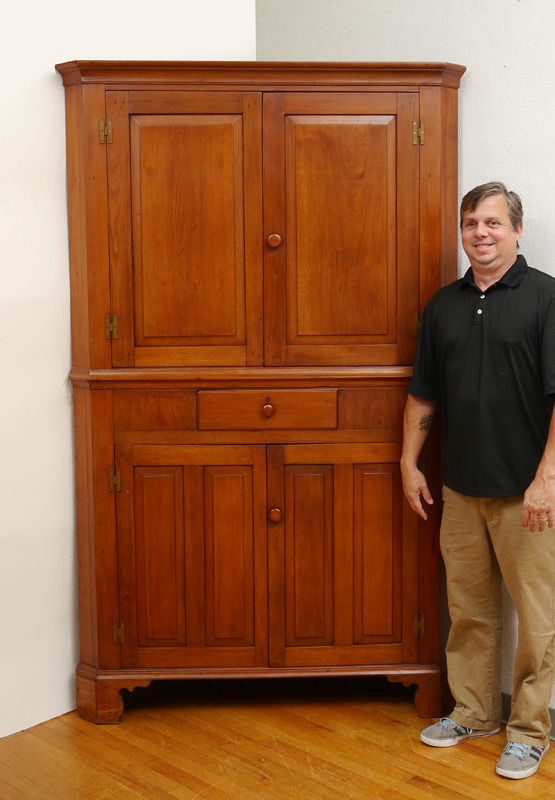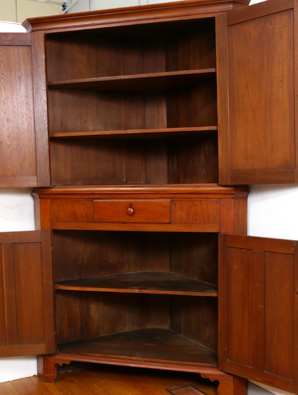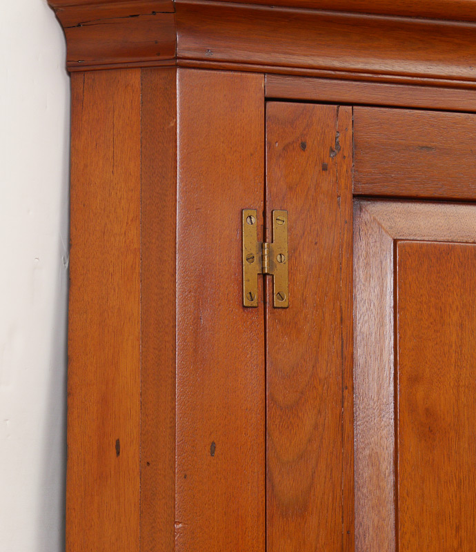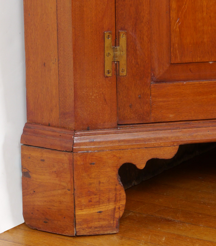 COUNTRY BLIND WALNUT CORNER CUPBOARD: Pegged construction, 2 doors with 2 shelves over small central drawer over 2 doors with single shelf. Bracket feet, overall measures 85 1/4'' h. x 52 3/4'' x 26''.