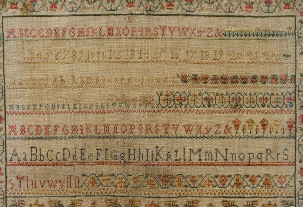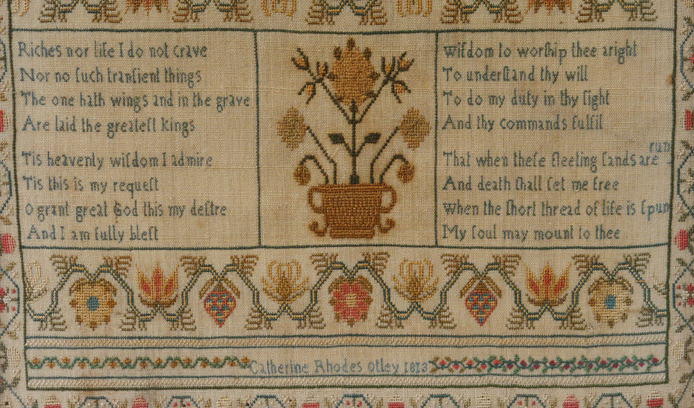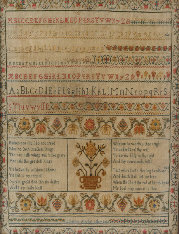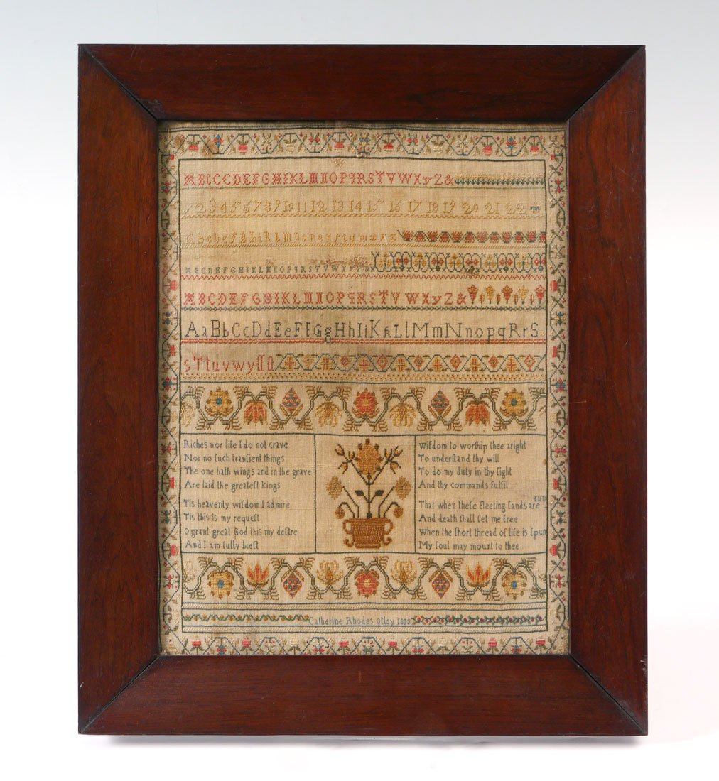 HAND WORKED SCHOOL GIRL SAMPLER: Dated 1813, worked by Catherine Rhodes Otley. Very small stitching of alphabets and motto, flowering borders. Framed under glass, 19'' x 18'' overall.