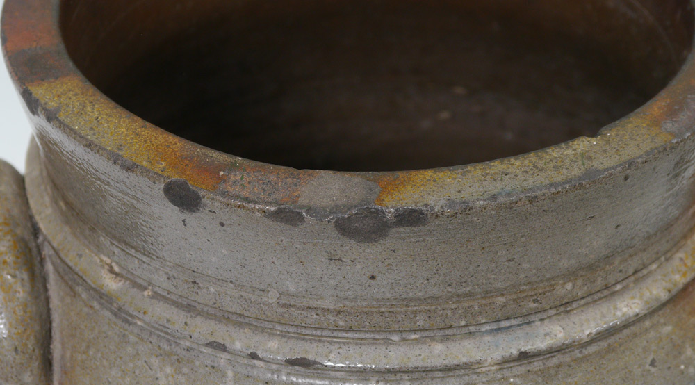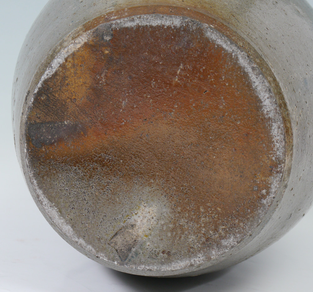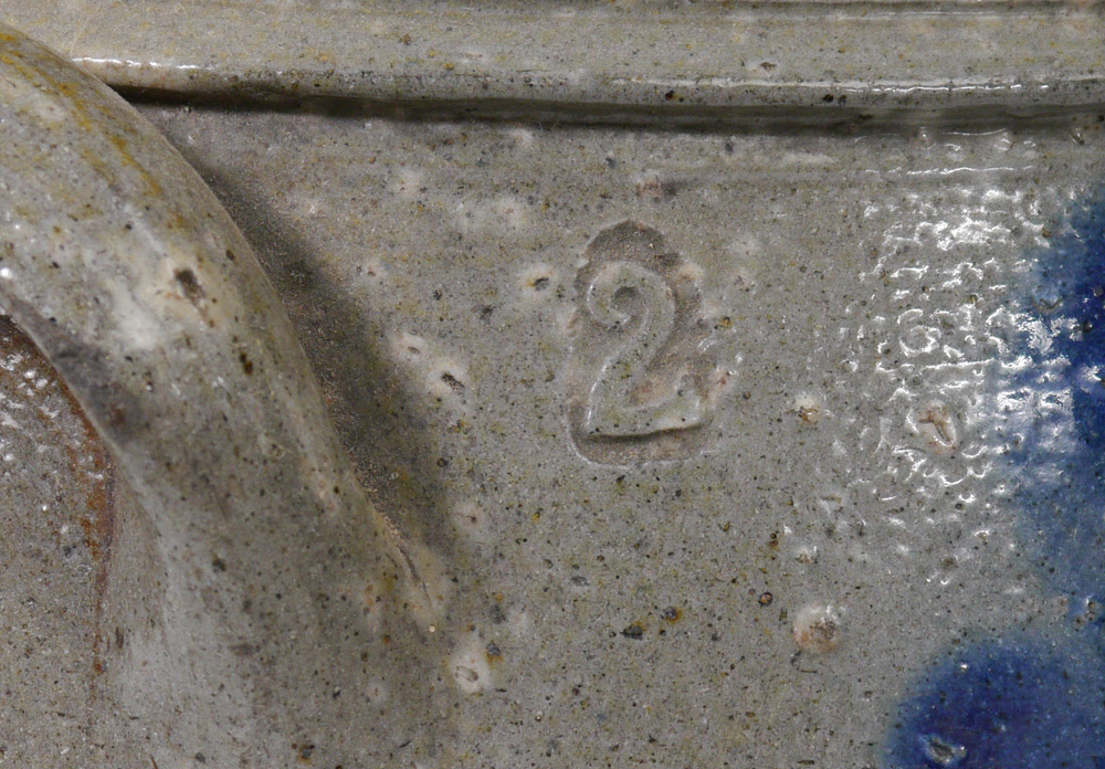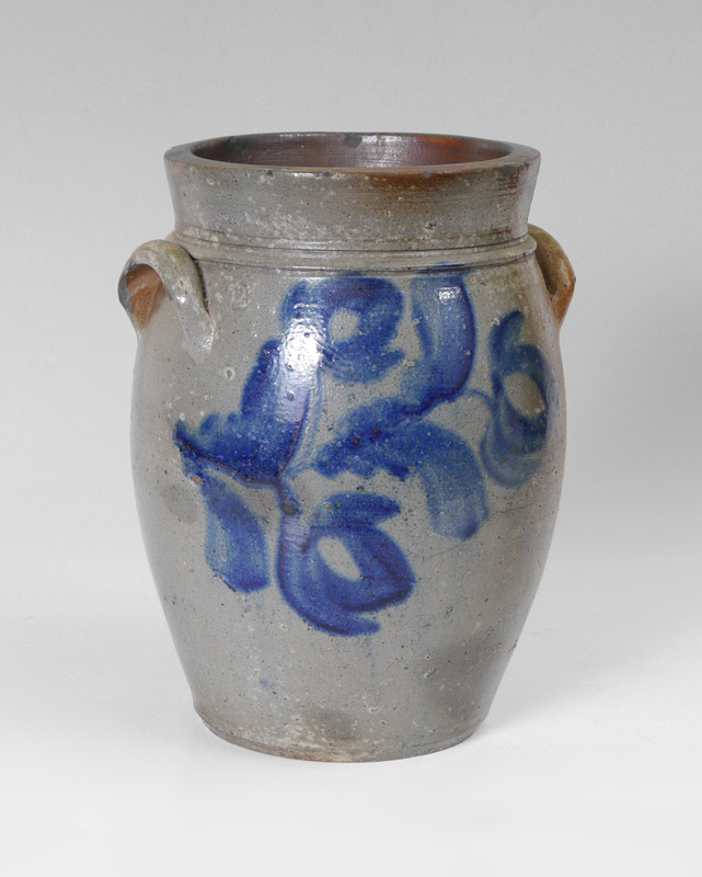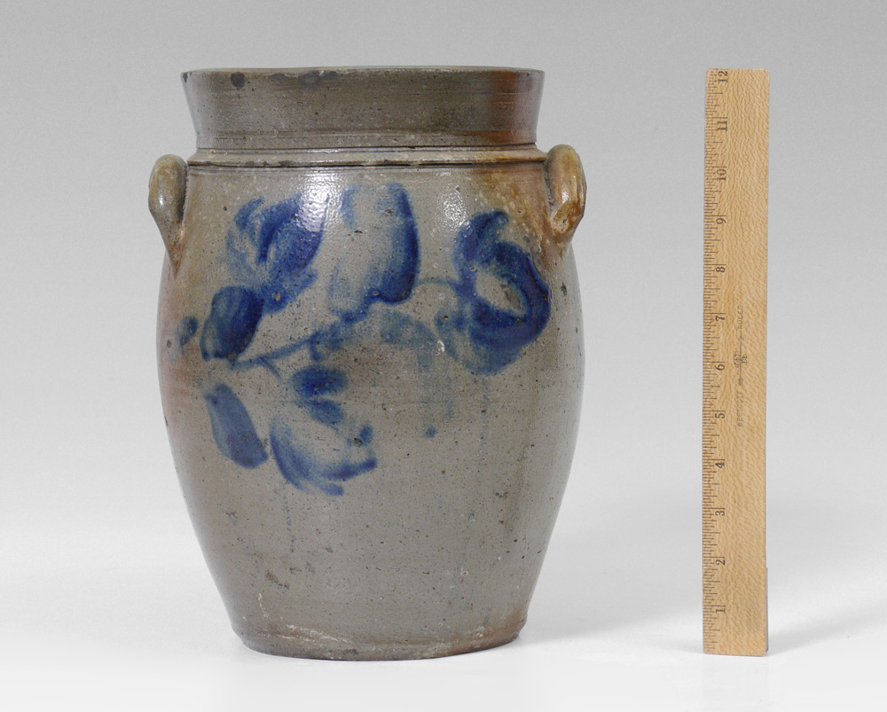 FLORAL BLUE DECORATED 2 GALLON CROCK: Unmarked, hand painted floral decoration both sides, salt glaze. Overall 12 1/4'' h. x 9''.