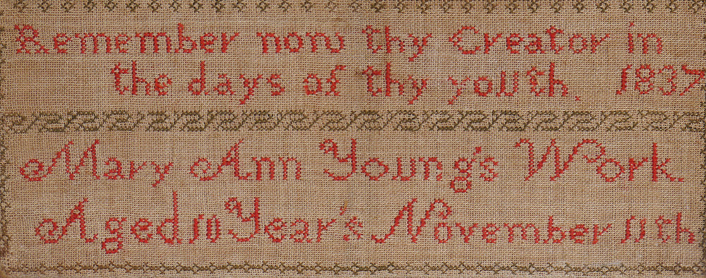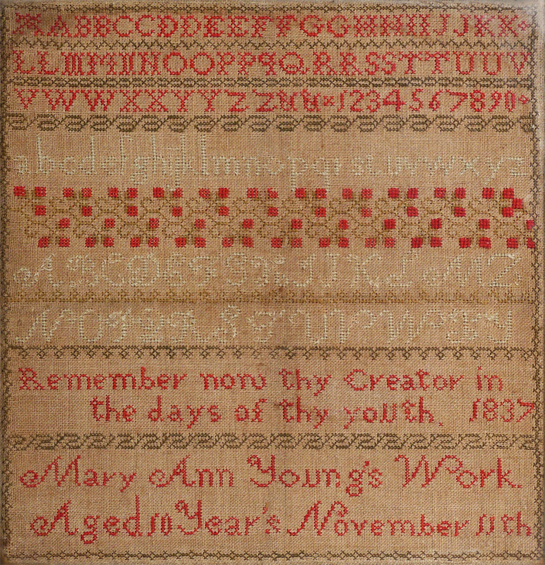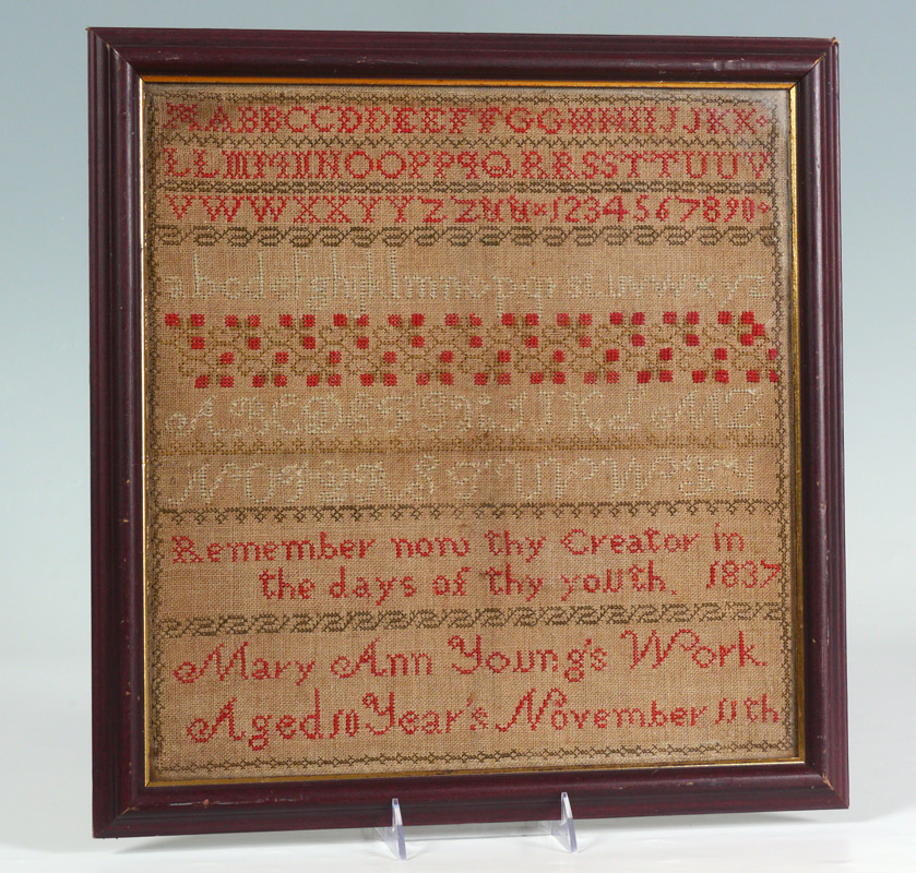 HAND WORKED SCHOOL GIRL SAMPLER: Worked by Mary Ann Young, dated 1837. Framed under glass, overall 17 1/4'' x 16 1/2''