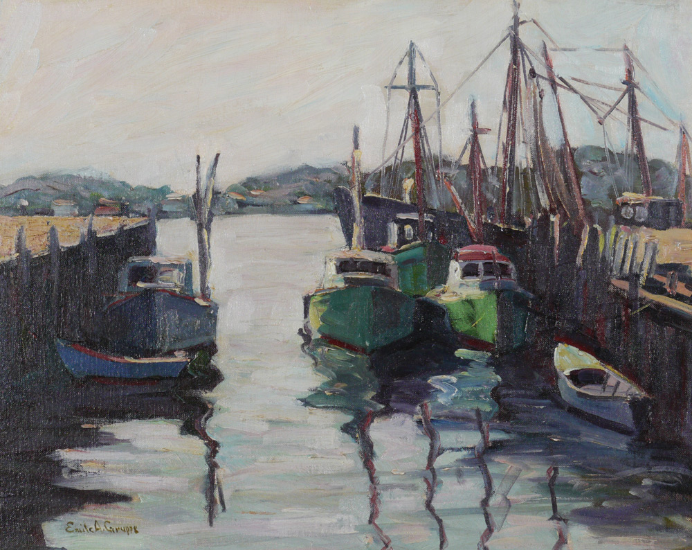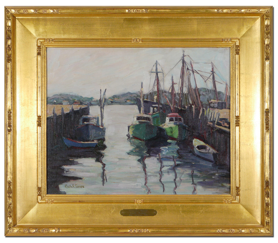 GRUPPE, Emile Albert, (American, 1896-1978): Gloucester Harbor, Dockside Scene, Oil/Canvasboard, 16'' x 20'', signed lower left, carved and gilded impressionist frame 24 1/2'' x 28 1/2''.