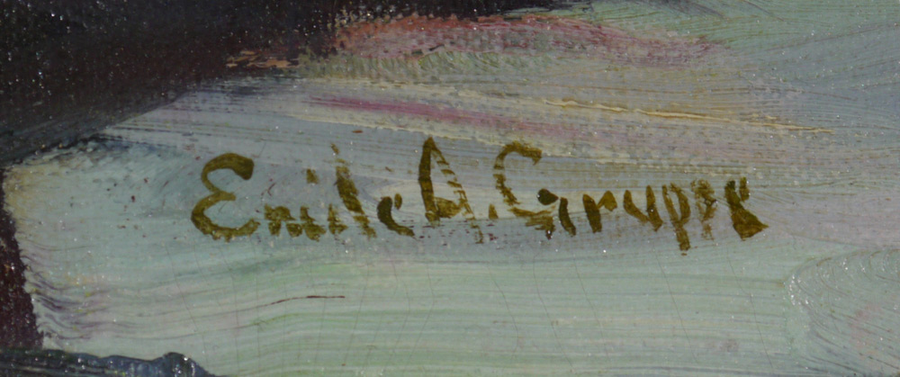CONDITION: Possibly enhanced signature that does fluoresce under blacklight. Not an item for the collector unfamiliar with Emile Gruppe's work.
