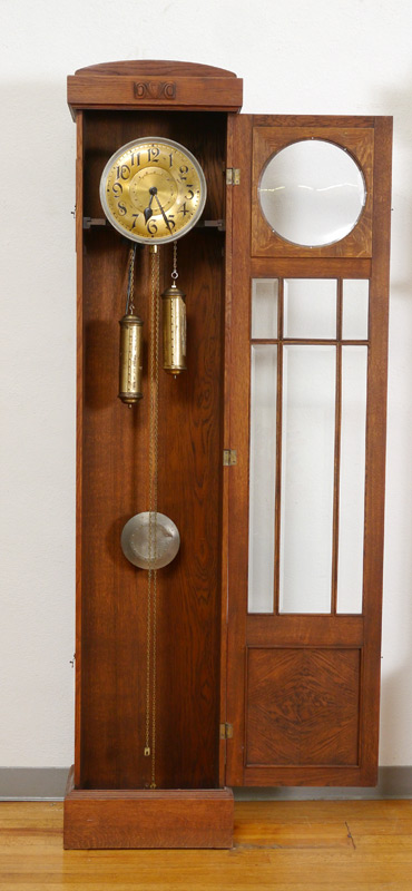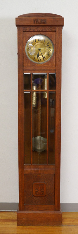 OAK GERMAN DECO GRANDFATHER CLOCK: Oak case with applied decoration, panelled door with beveled glass. Brass face with Arabic numerals, weight driven time and strike movement. Overall 82 1/2'' h. x 18 1/4'' x 9 1/2'' CONDITION: Currently not running.