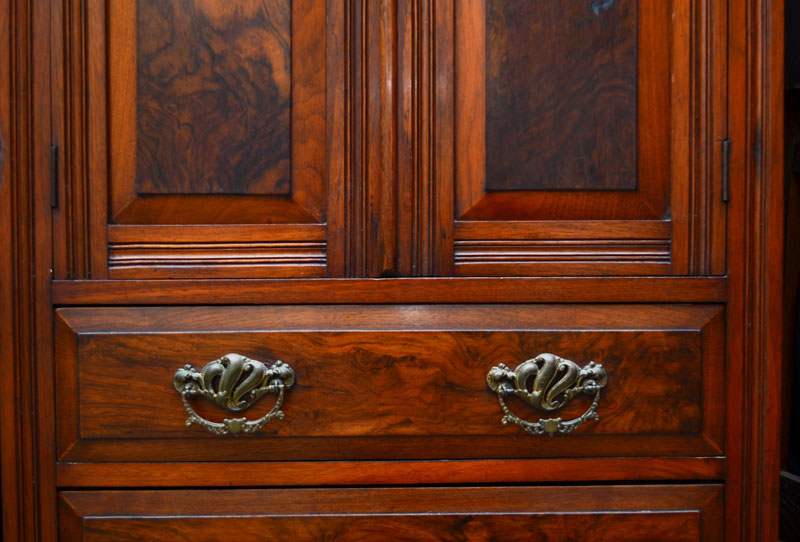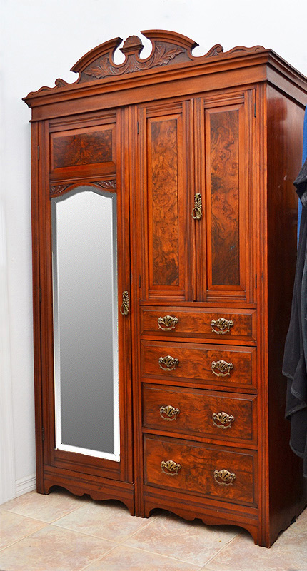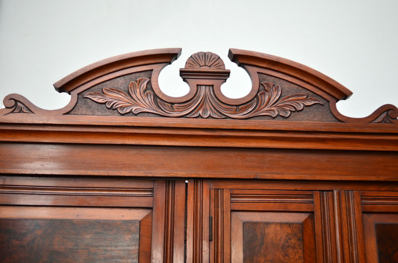 VICTORIAN BURL WALNUT SCHRANK: Burl walnut veneer accents, carved broken arch pediment. Left side single door with shaped beveled glass mirror, interior replacement PVC rod below shelf. Right side with double doors over 4 graduated drawers. Shaped front feet, overall 89 1/2'' h. x 53 1/4'' x 23 1/4''.