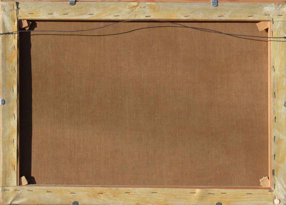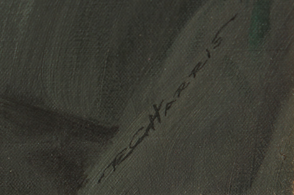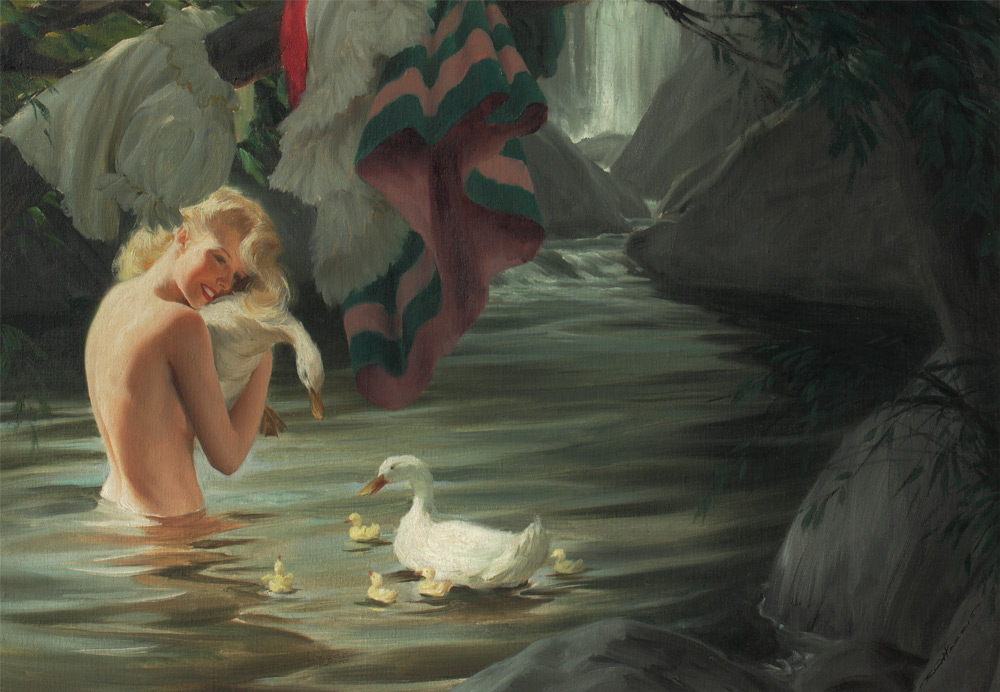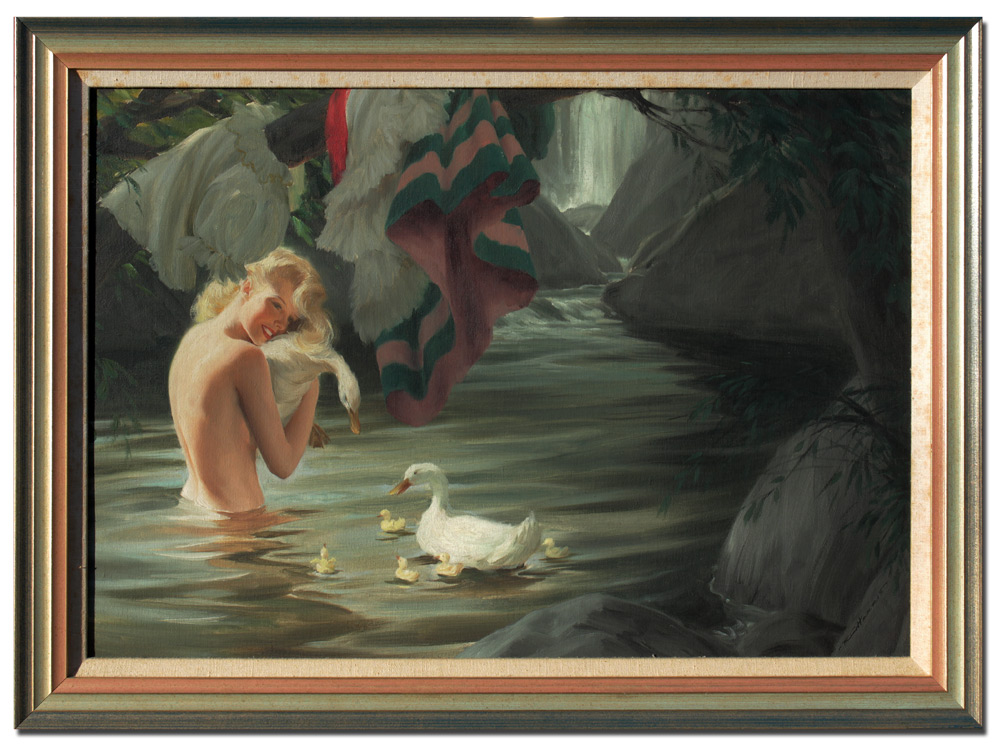 HARRIS, Robert George, (American, 1911-2007): Illustration Depicting a Young Blonde Beauty Bathing with a Family of Peking Ducks, Oil/Canvas, 18'' x 26'', signed lower right, original frame 22'' x 30'', purportedly purchased directly from the artist.