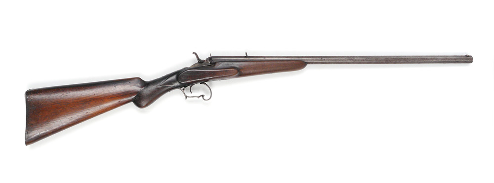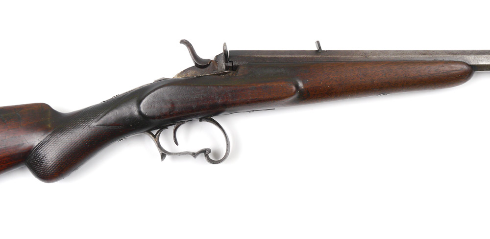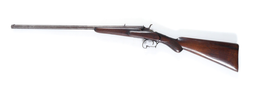 BELGIAN FLOBERT SINGLE SHOT RIFLE: Circa late 1880's to early 1890's, .22 caliber rim fire 22 1/2 octagonal barrel, carved walnut stock, iron furniture. Unmarked barrel with Belgian proof mark, action currently working, overall 38''.