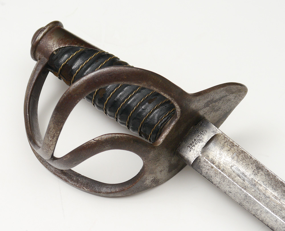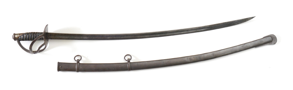 CIVIL WAR ERA TIFFANY MODEL 1840 CAVALRY SWORD: Hilt with iron pommel, guard and knuckle bow, leather wrap with brass twist wire. 36'' plain blade marked on ricasso ''Tiffany & Co., New-York'' and ''P.D.L.'' verso. Metal scabbard, overall 43 3/4''.