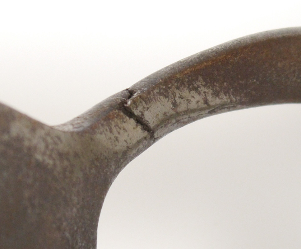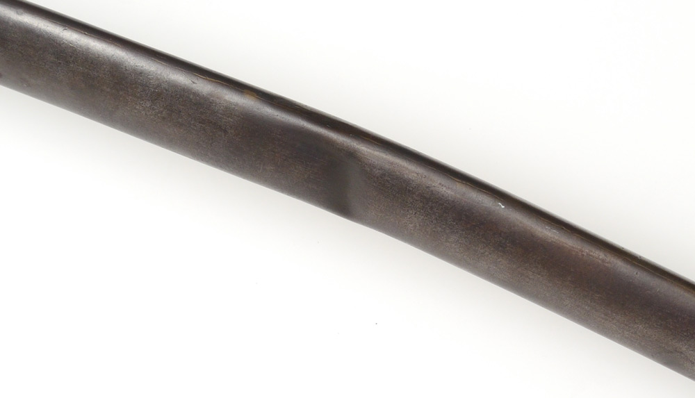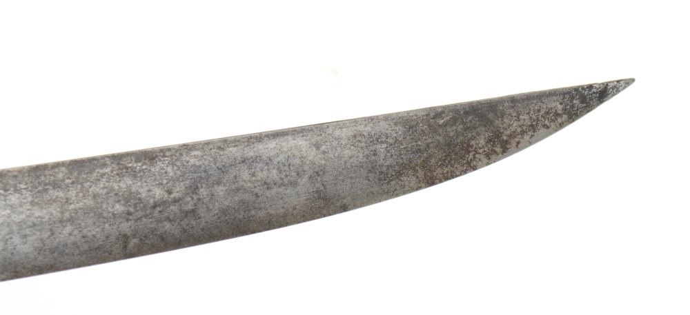CONDITION: Repair to one branch of guard, loss to leather, spotting and minor pitting on blade, dings to scabbard.
