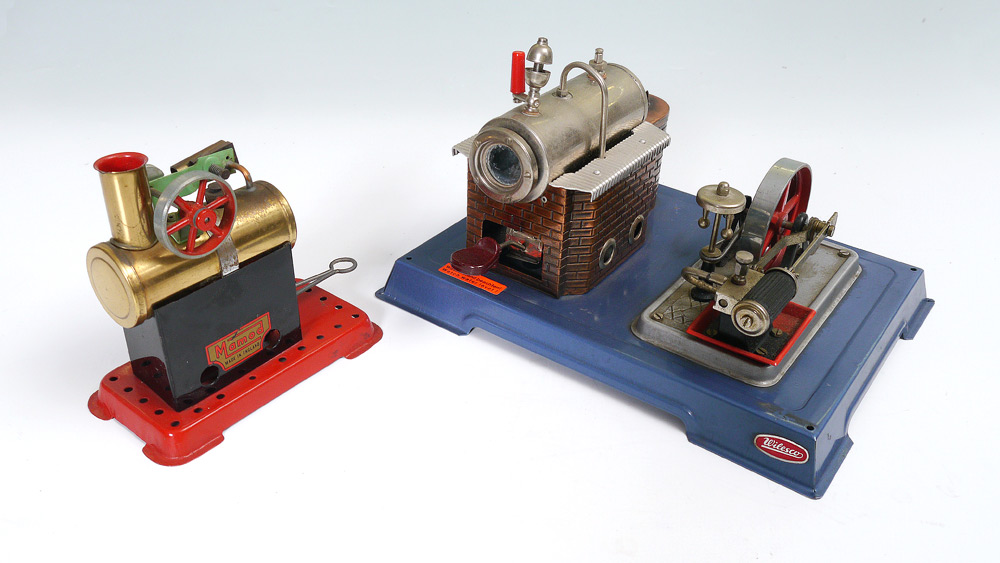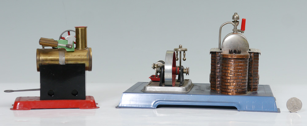 2 PIECE MAMOD & WILESCO STEAM ENGINES: 2 pieces total to include 1) Mamod Little Steam engine with original decal. 5 1/4'' h. x 5 3/4'' x 3''. 2) Wilesco horizontal engine, missing stem stack. 6'' h. x 10 3/8'' x 8''.
