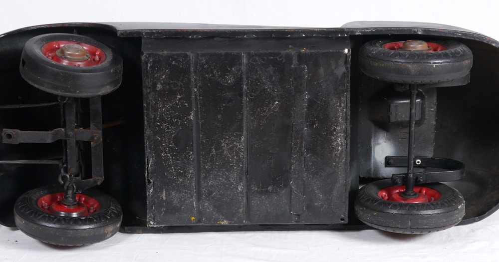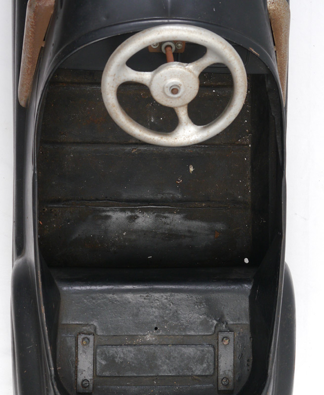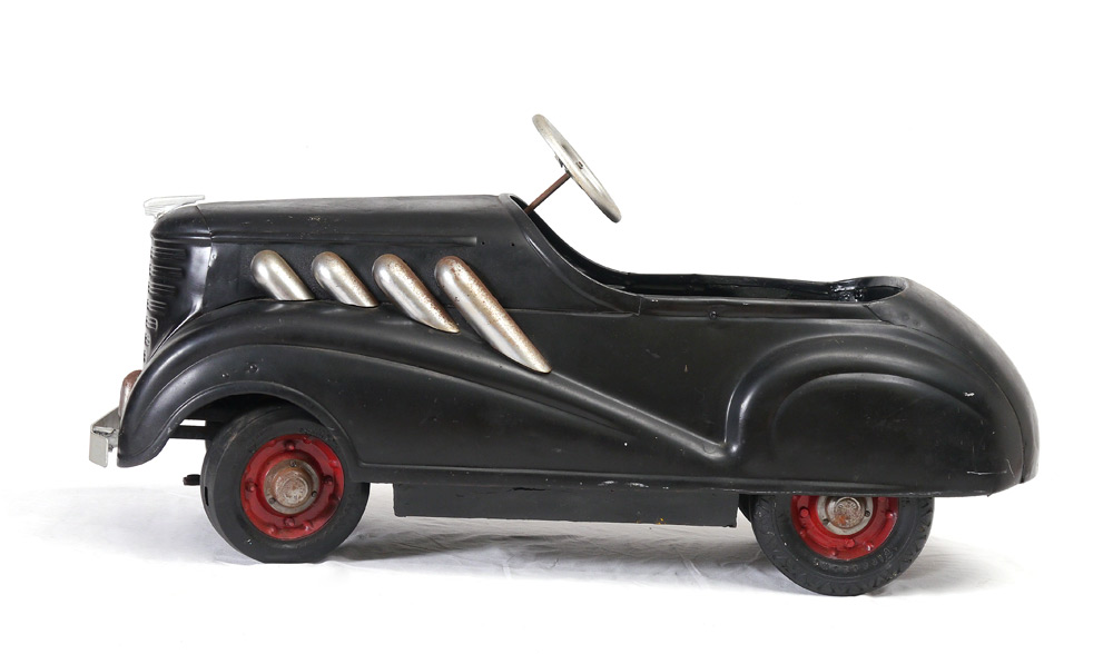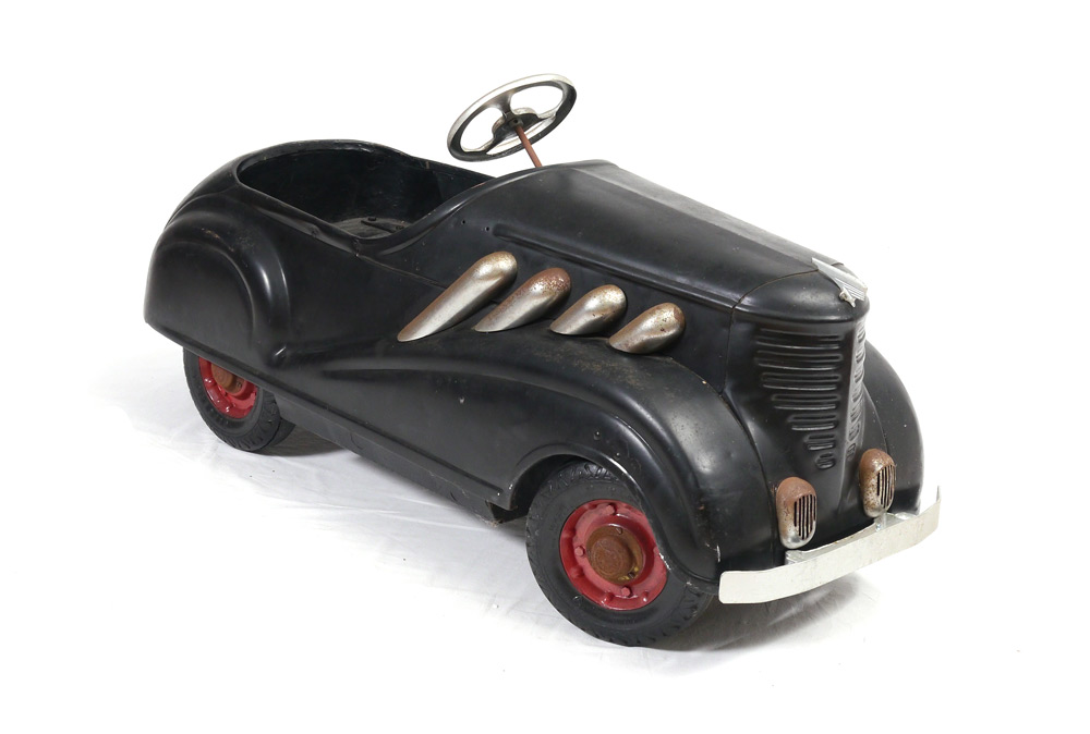 1937 STEELCRAFT AUBURN SUPER CHARGER PEDAL CAR: Painted black at some time with nickel exhaust, hood ornament, and steering wheel. Wheels with painted red center. Incomplete and missing several pieces, well worthy of restoration. Overall measures 24 1/2'' x 50'' x 17 1/2''.