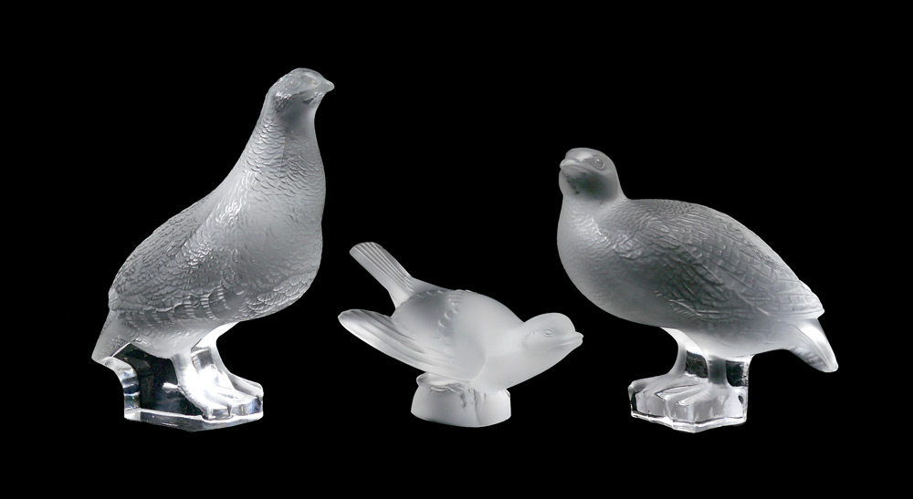 3 PIECE LALIQUE CRYSTAL BIRDS: To include 2 doves, one 6 3/4'' h. x 6'', the other 5 1/4'' h. x 5 1/4''. Sold with sparrow in flight, 3 1/4'' h. x 5 1/4''.