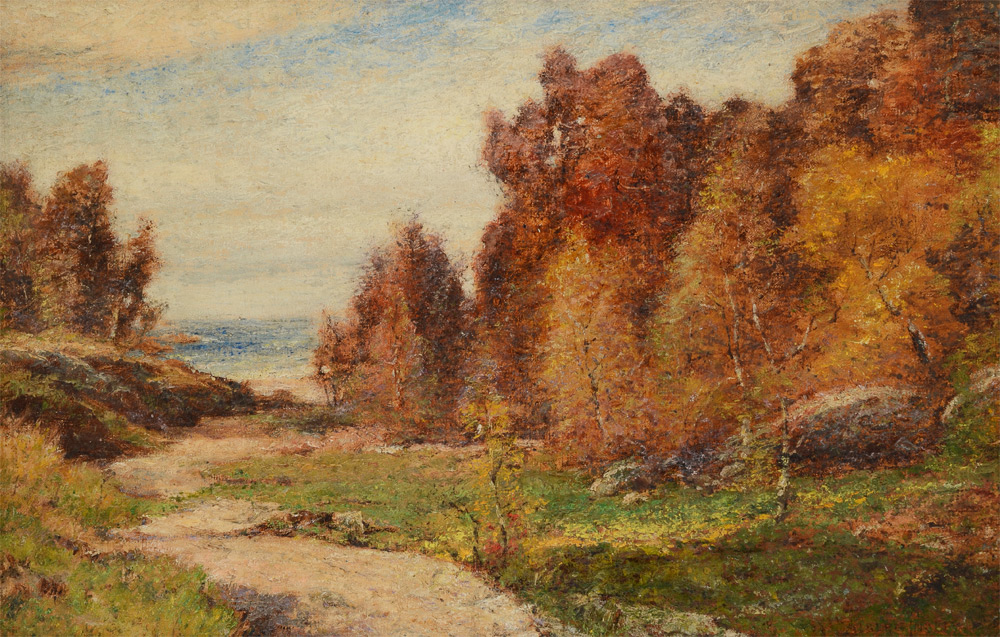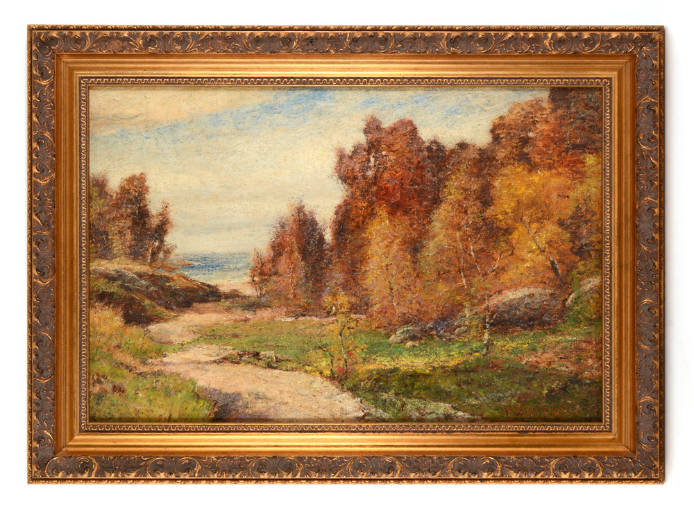 INSLEY, Albert Babb, (American, 1842-1937): Autumnal Landscape with Path Leading to Water, Oil/Canvas, 12'' x 18'', signed lower right, framed 15 3/4'' x 22''.