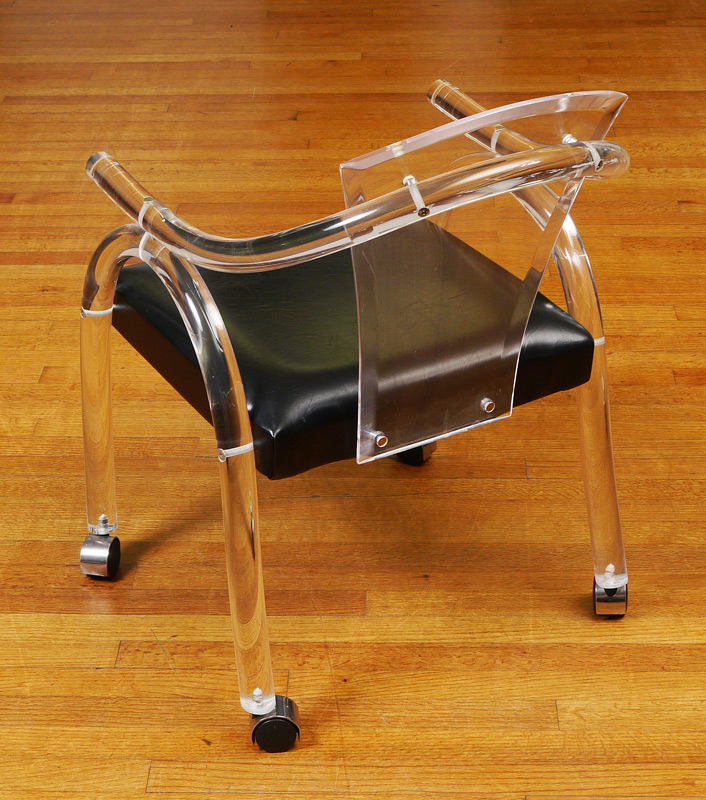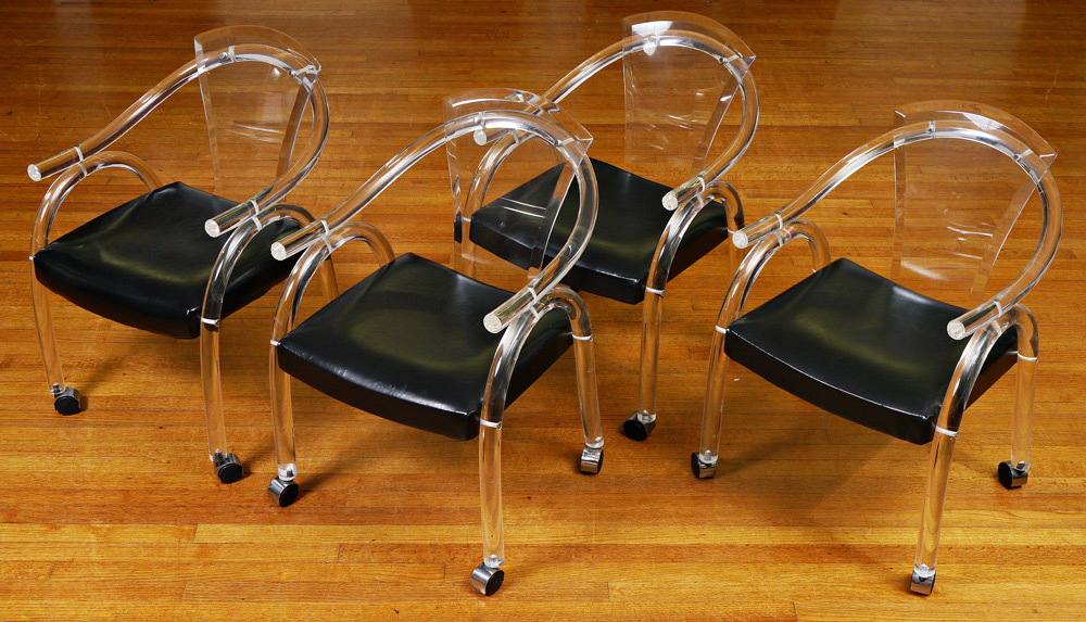 SET OF 4 LUCITE ARM CHAIRS: Tubular arms and legs, beveled back splat, black leather upholstery, on 4 castors. Overall measures 32 1/4'' h. x 21 1/2'' x 26''.
