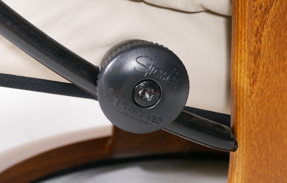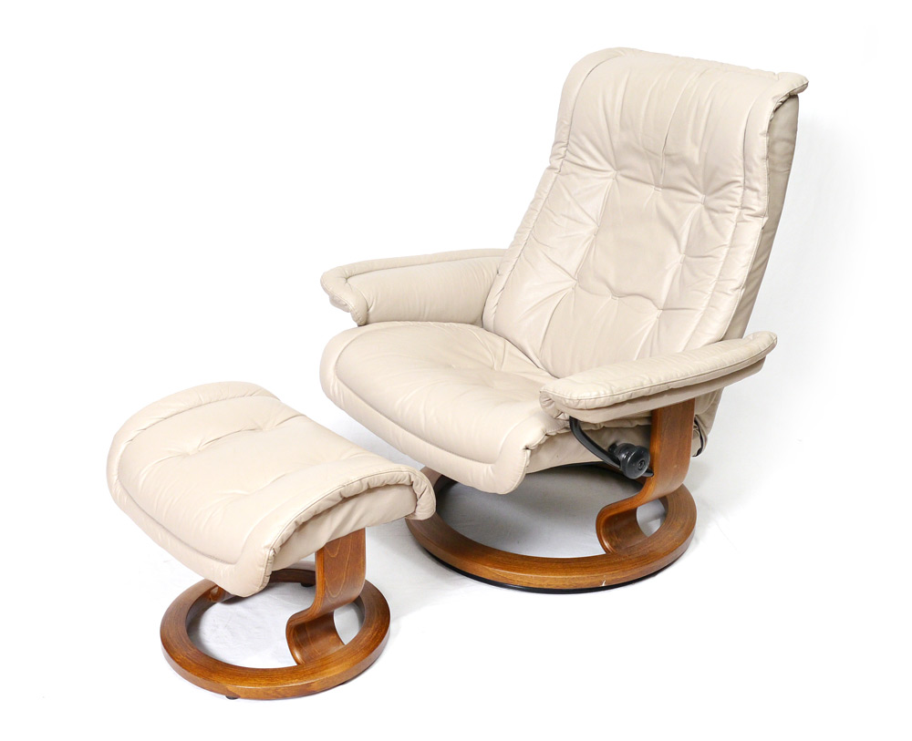 EKORNES STRESSLESS CHAIR & OTTOMAN: Leather upholstery, Ekornes Made in Norway label. Chair 40 1/4'' h. x 29 3/4'' x 28'', ottoman 16 1/4'' h. x 19 1/4'' x 15 1/4''.