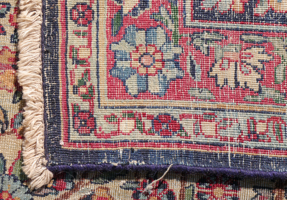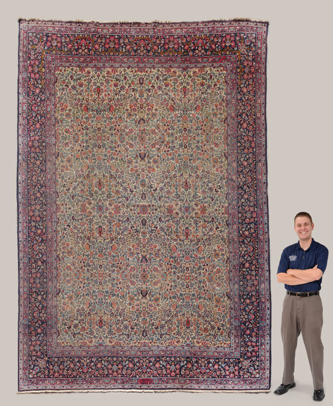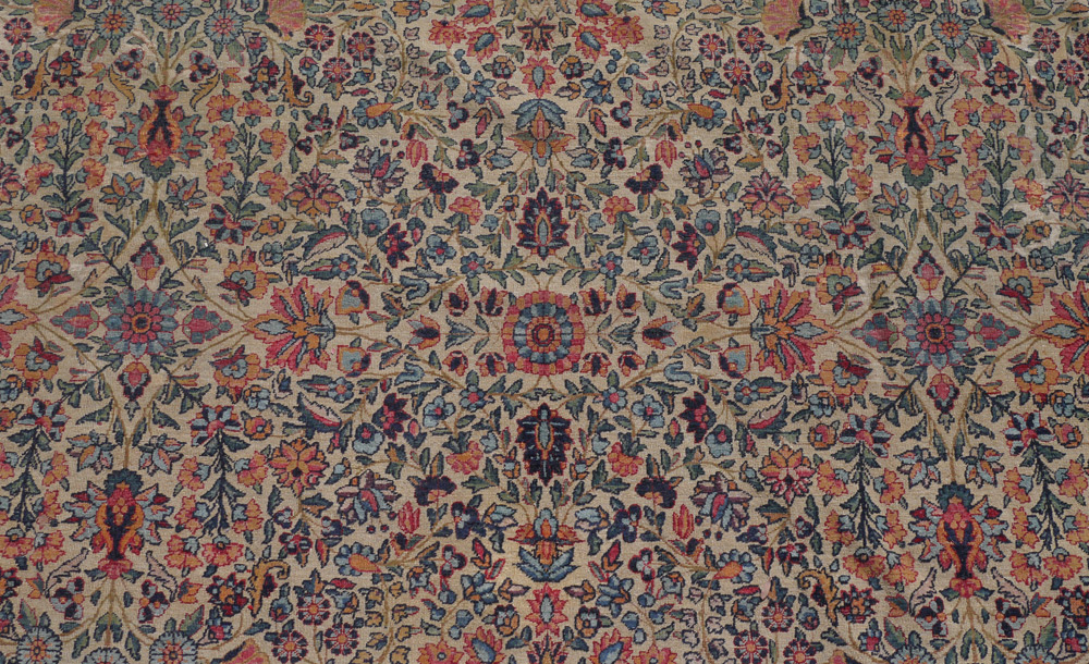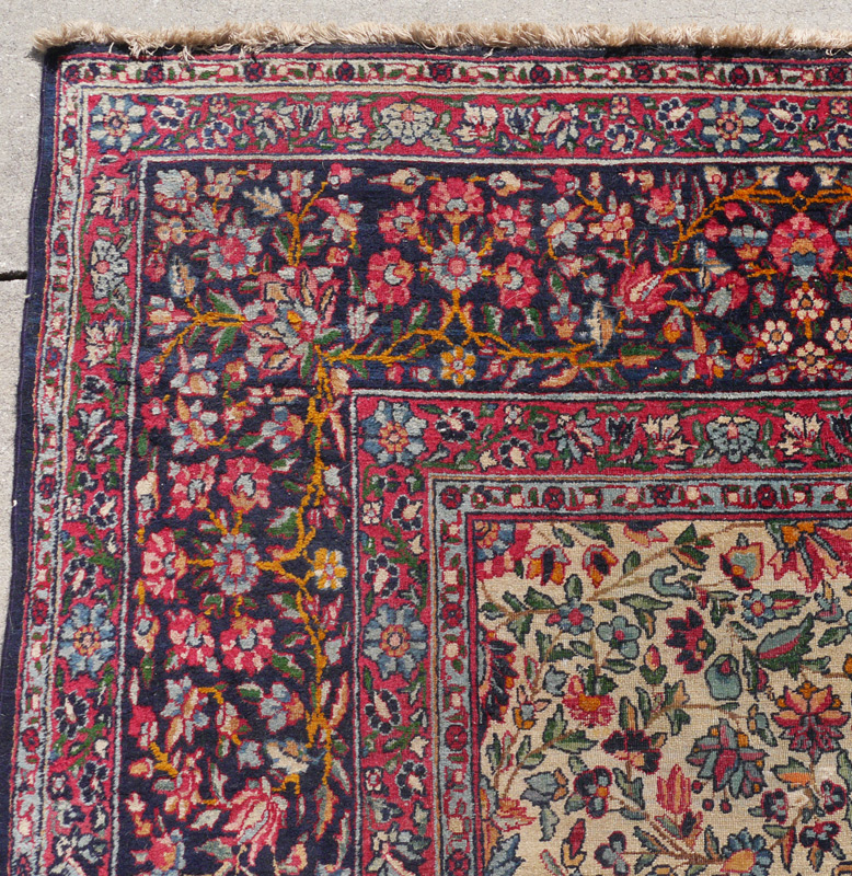 APPROX 75 TO 85 YR OLD PERSIAN KERMAN HAND KNOTTED WOOL RUG, 8'10'' x 12'1'': This Kerman has the more desirable overall pattern as its central design. Also, there is a signature cartouche found in the center of one of the guard borders on one end of the rug. The ivory field is covered with a profusion of many types and sizes of flowers with stems and leaves done in colors that include shades of rose, pink, green, blue, peach and beige. The borders colors range from a midnight blue ground main border to medium blues and red guard borders, all covered with more flower motifs