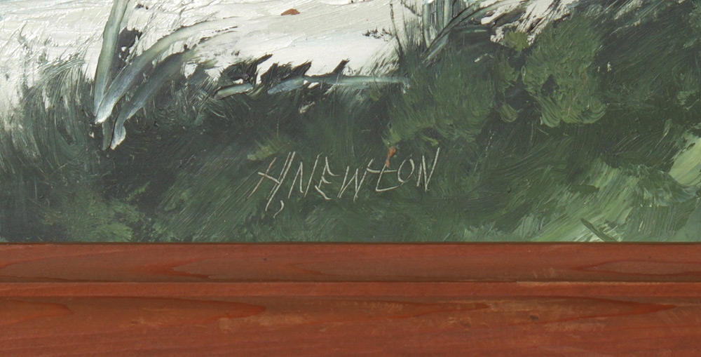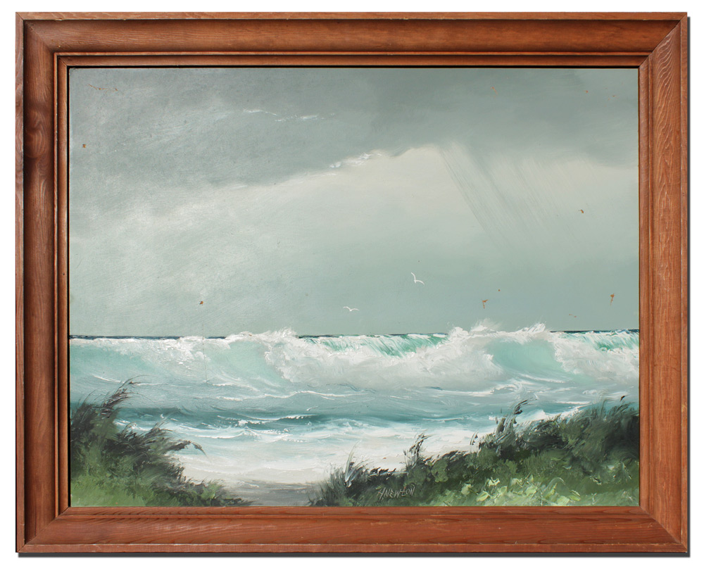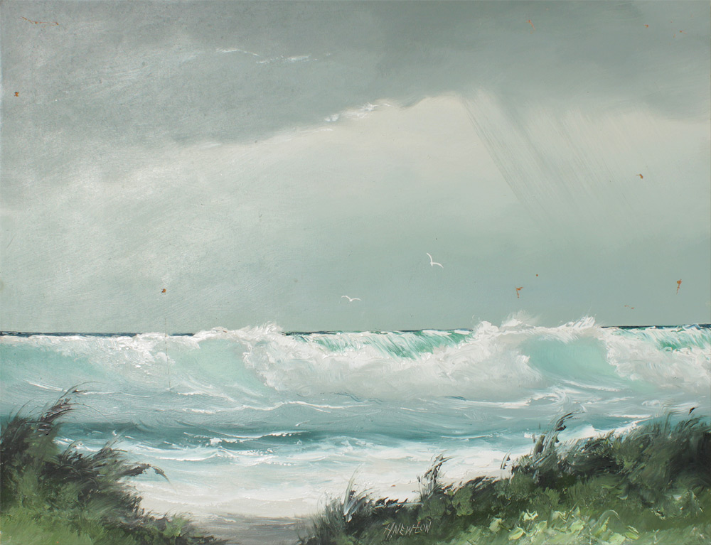 NEWTON, Harold, (American, 1934-1994): Florida Highwaymen Stormy Ocean scene, Oil/Masonite, signed lower center, 24'' x 32'', wood frame 27 3/4'' x 36''.