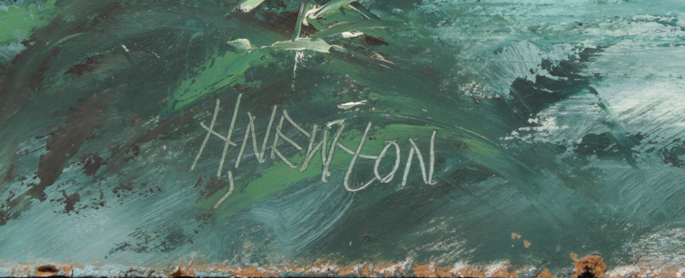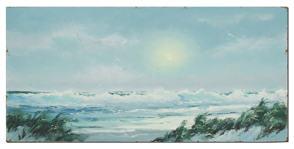 NEWTON, Harold, (American, 1934-1994): Florida Highwaymen Beach Front scene with Crashing Surf, Oil/Masonite, signed lower left. Measures 21 1/2'' x 44''.