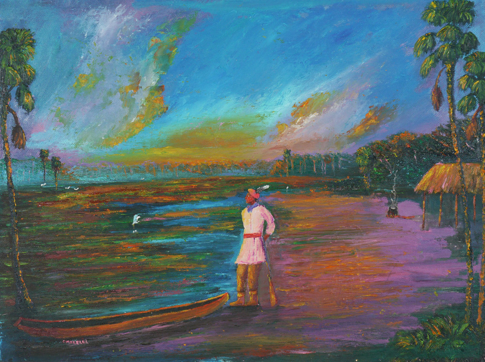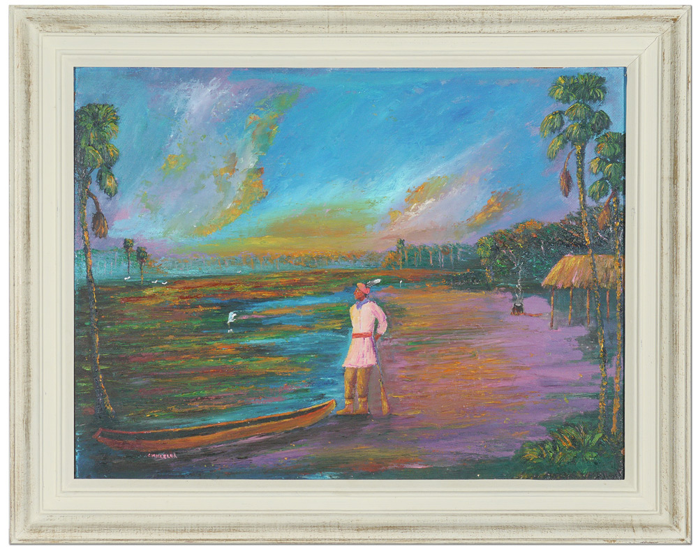 WHEELER, Charles ''Chico'', (American, 20th Century): Vibrant Florida Highwaymen Seminole Indian Scene, Oil/Masonite, signed lower left under canoe, 18'' x 24'', white painted frame 22 3/4'' x 28 3/4''.