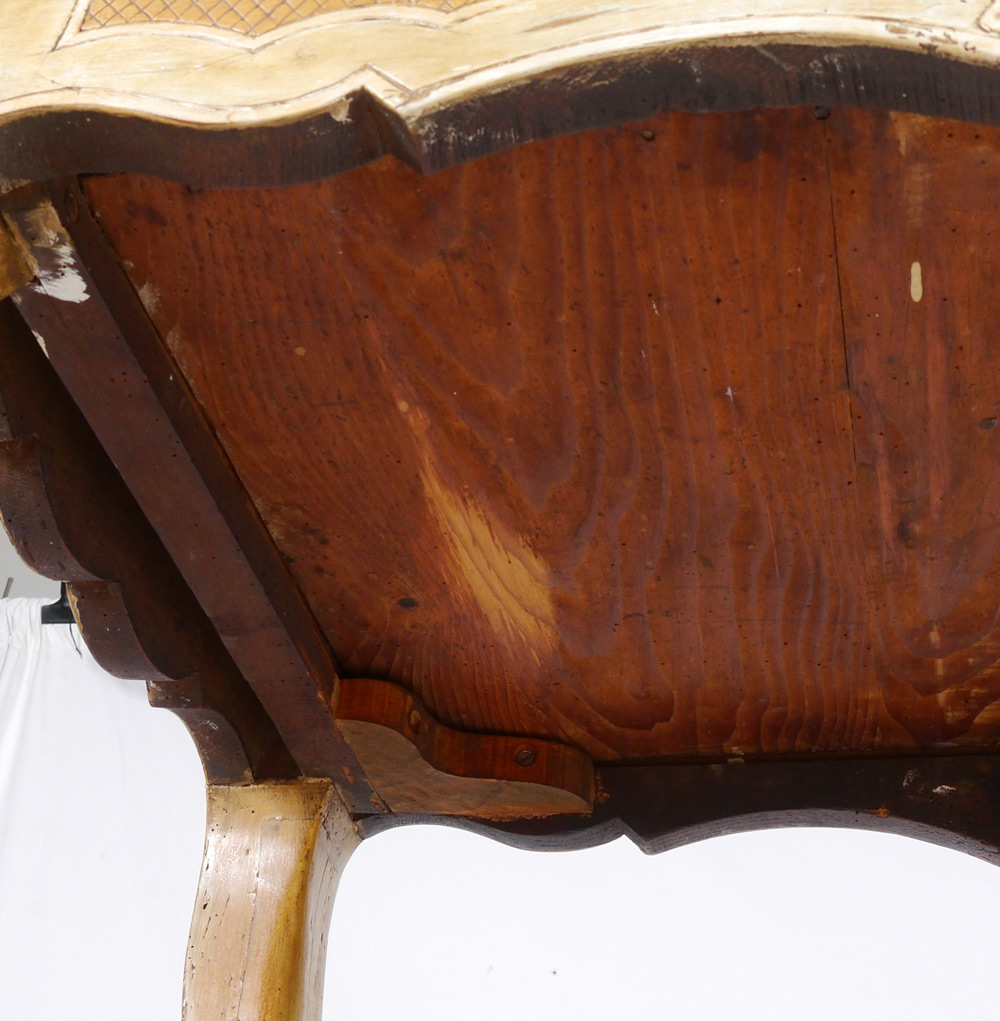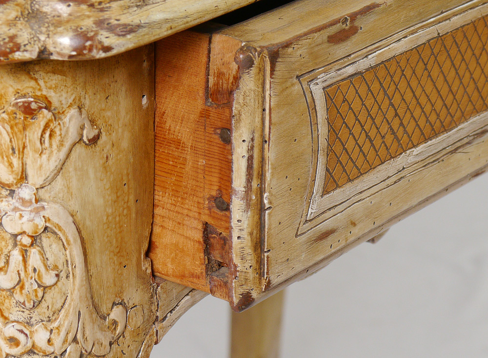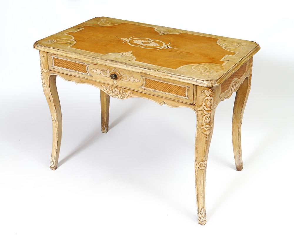 PAINT DECORATED LADIES WRITING DESK: Carved and paint decorated top and skirt, single full length drawer on one side. Carved and shaped legs, 29'' h. x 38 1/2'' x 23 1/4''.