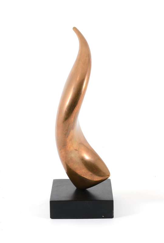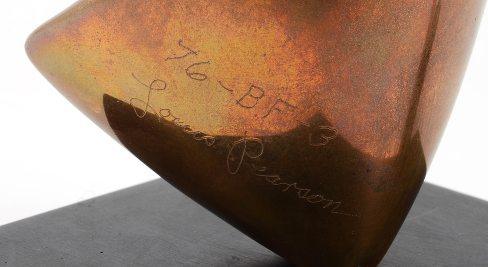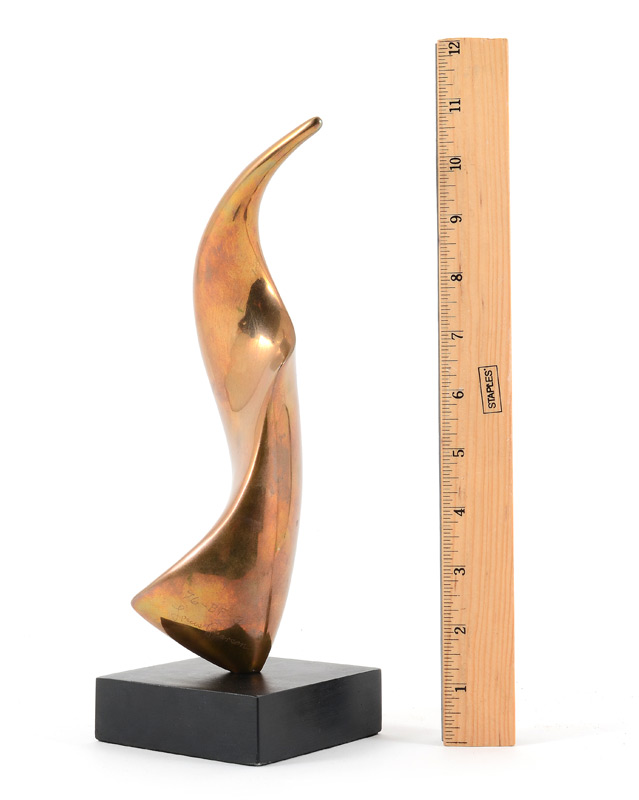 LOUIS PEARSON ABSTRACT BRONZE SCULPTURE: 9 1/2'' h., incised signature on the base, measures 76 BF-3, sits on an ebonized square plinth on a peg which allows it to rotate.