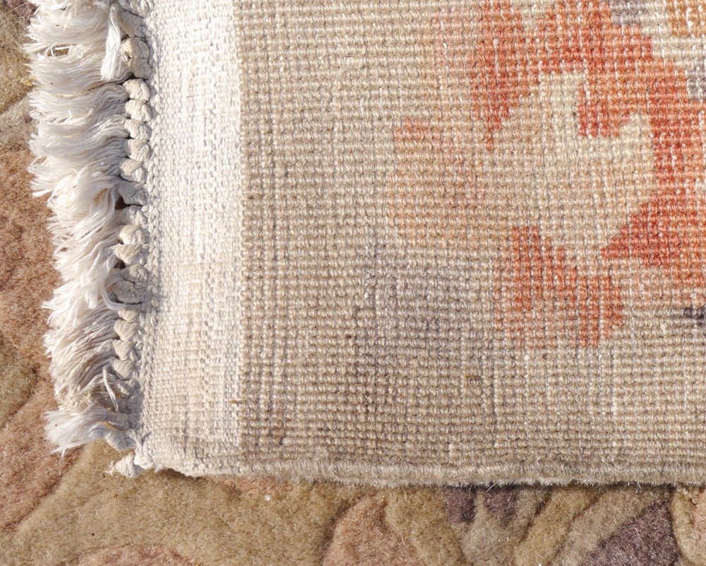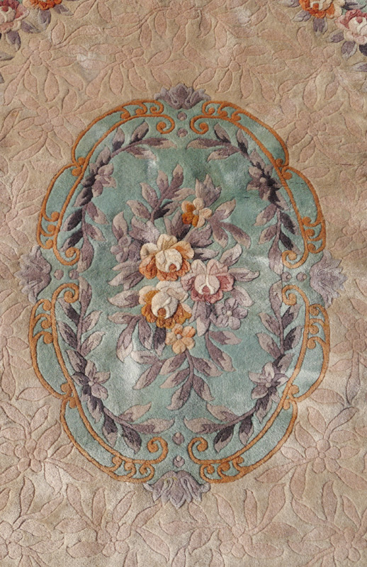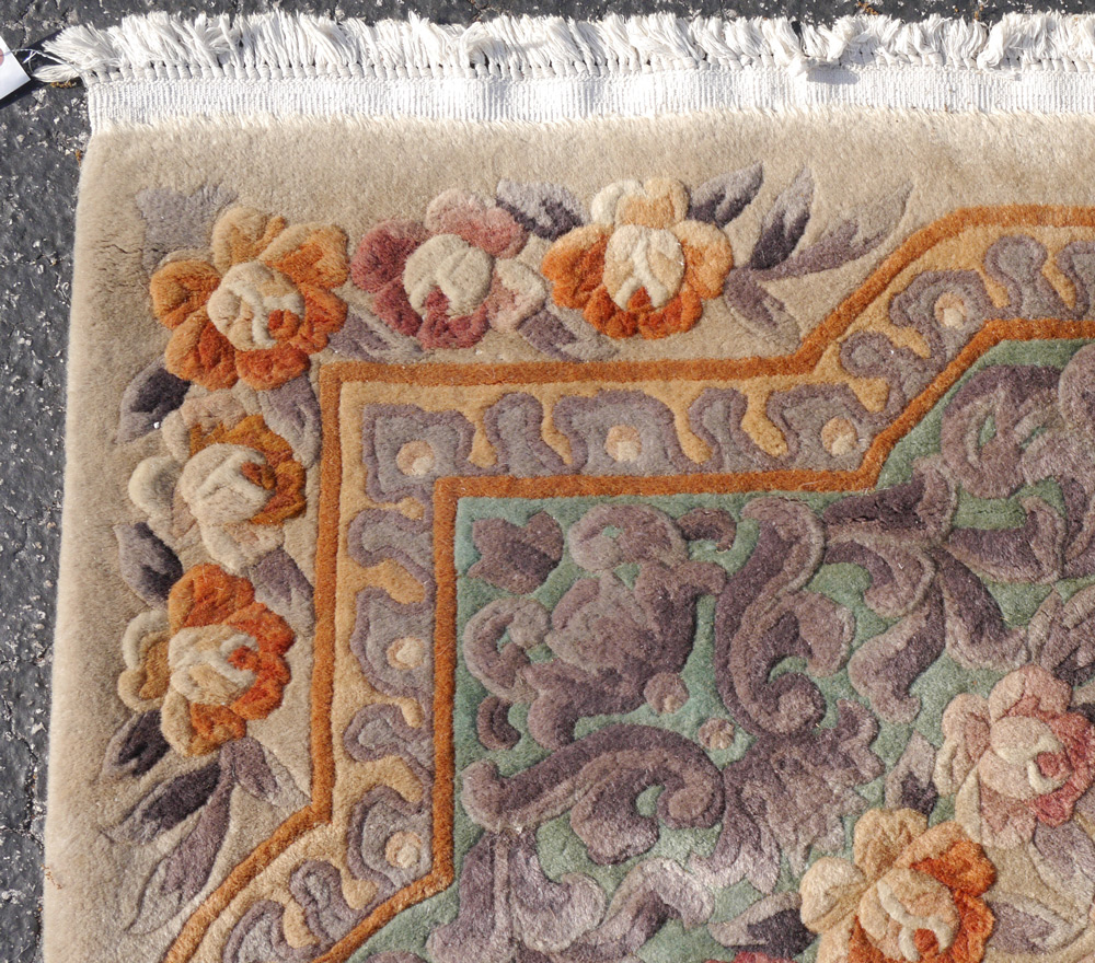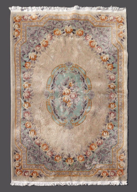 APPROX. 30 TO 50 YR. OLD CHINESE HAND KNOTTED WOOL RUG, 5' 6'' x 7' 11'': This rug has a French Aubusson design that includes an oval central medallion in soft colors of pale aqua, charcoal grey, yellow, pale orange, white, and rose pinks. The medallion sits on a pale two-toned beige field that has an inner set of borders consisting of a row of large single flower-heads followed by charcoal grey scrolling leaves that rest on the pale aqua corners. The outer borders of the rug are ''broken'' in that they don't follow a straight line around the field of the rug, but curve in at the corners of the rug.