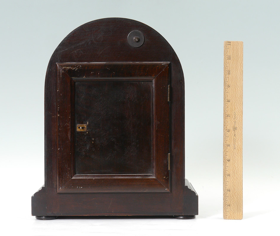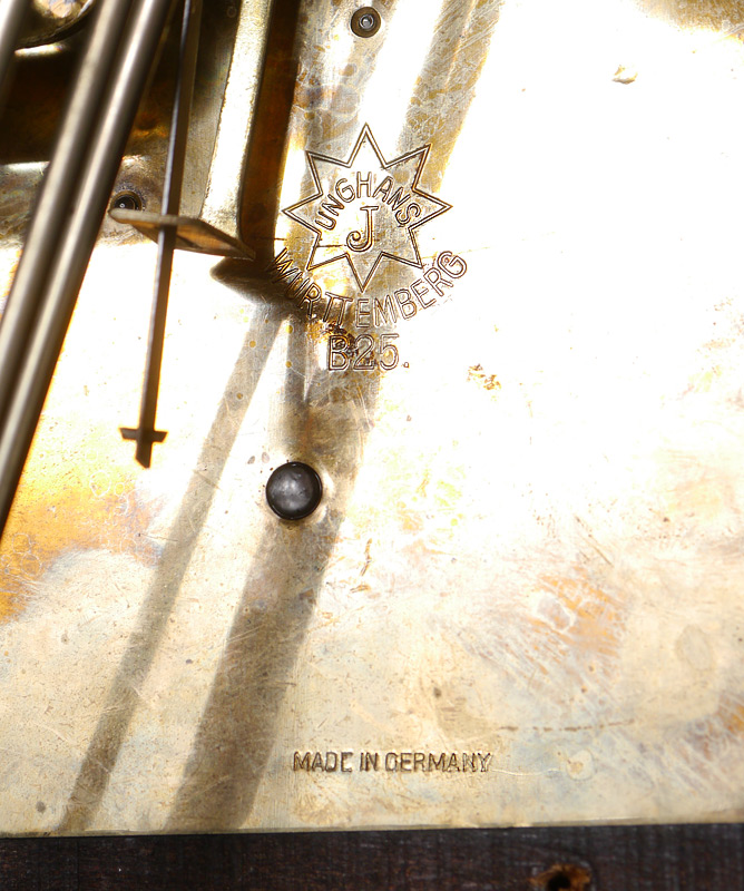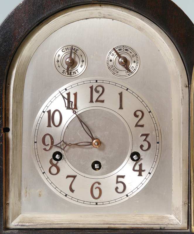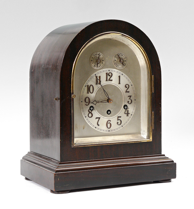 JUNGHANS GERMAN MANTLE CLOCK: Rounded mahogany case, silvered face with secondary chime/silent and slow/fast dials. Applied Arabic numerals, marked Junghans Germany. Time and strike movement marked Junghans, overall 13 1/2'' h. x 11 1/4'' x 7 1/2''.
