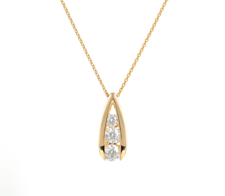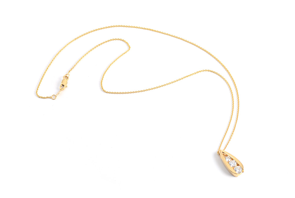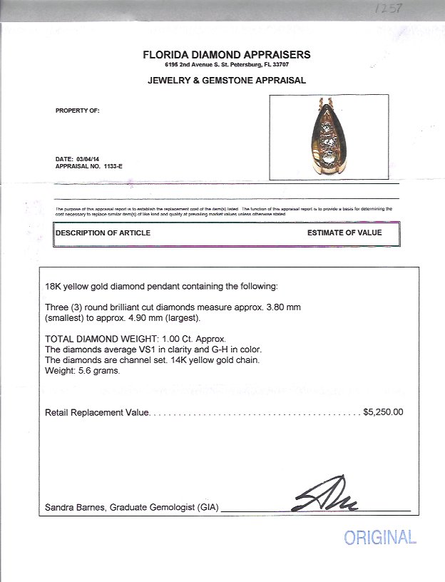 EXCEPTIONAL THREE STONE DIAMOND PENDANT NECKLACE: 18k yellow gold pendant with 3 round brilliant cut, channel set diamonds totaling approx. 1.00 Ct., averaging VS1 in clarity and G-H color. The 14K chain is 18'' in length. Weight 5.6 grams. Sold with current Florida Diamond Appraisers GIA graduates appraisal for $5,250.