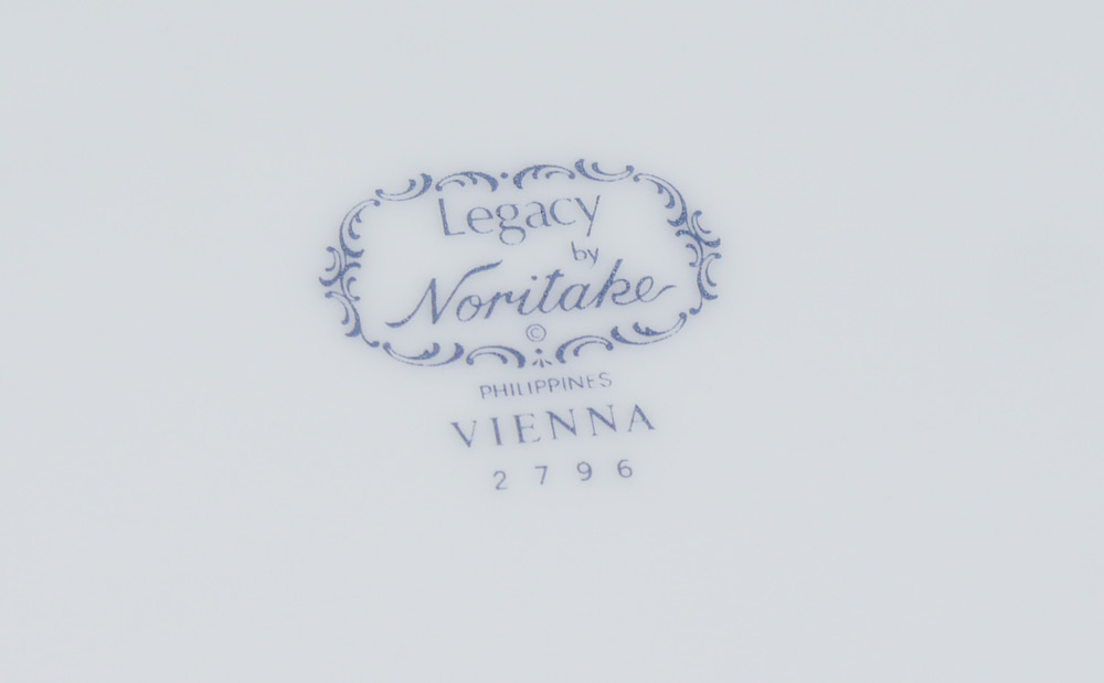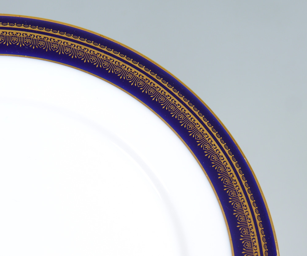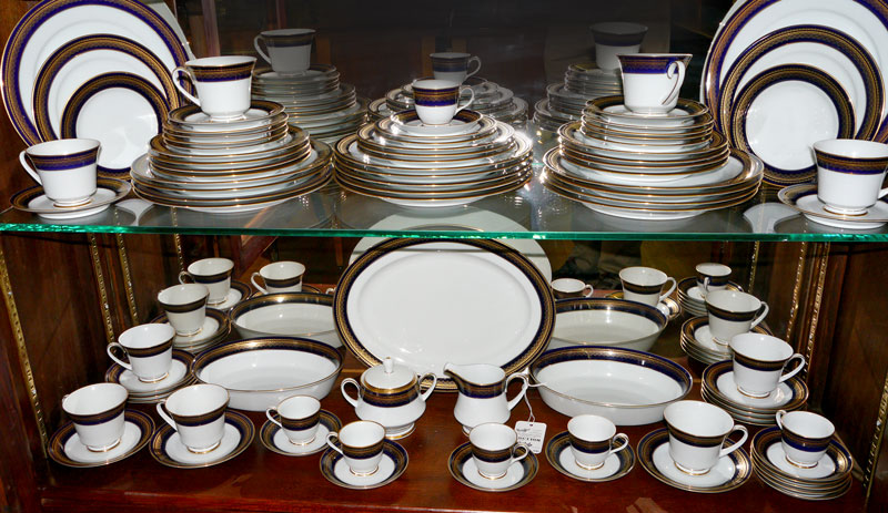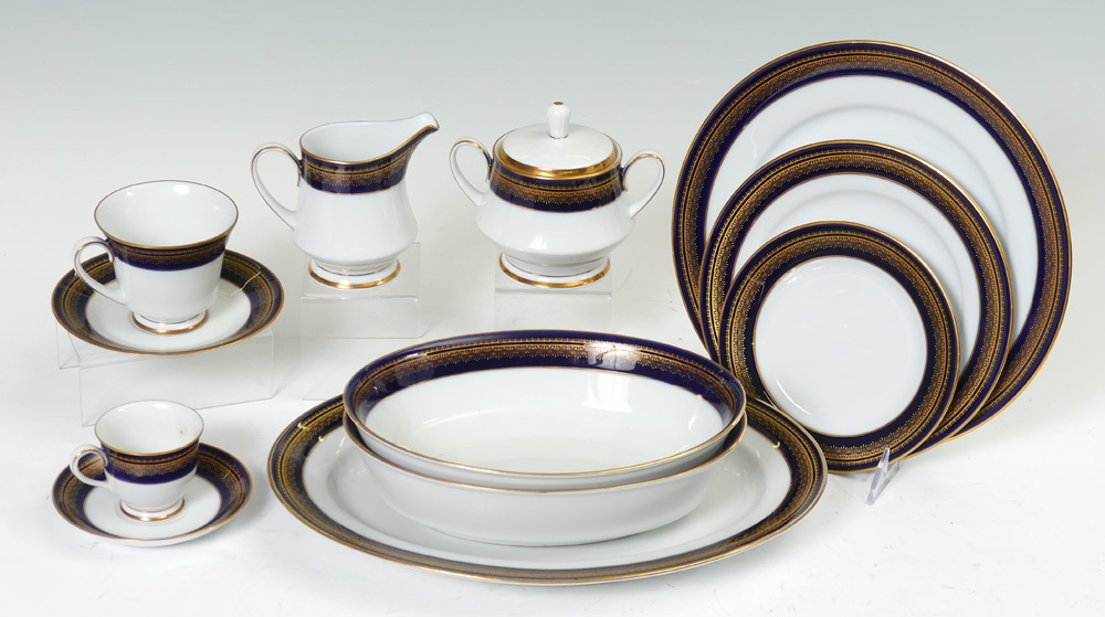 NORITAKE COBALT AND GOLD RIM FINE CHINA IN THE VIENNA PATTERN: Approx. 85 pieces to include 15 dinner plates (10''), 13 salad plates, 12 bread plates, 9 footed cups, 14 saucers, 7 demi-tasse cups with 10 saucers, creamer, sugar, 2 open vegetable bowls and the platter.