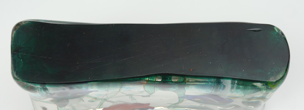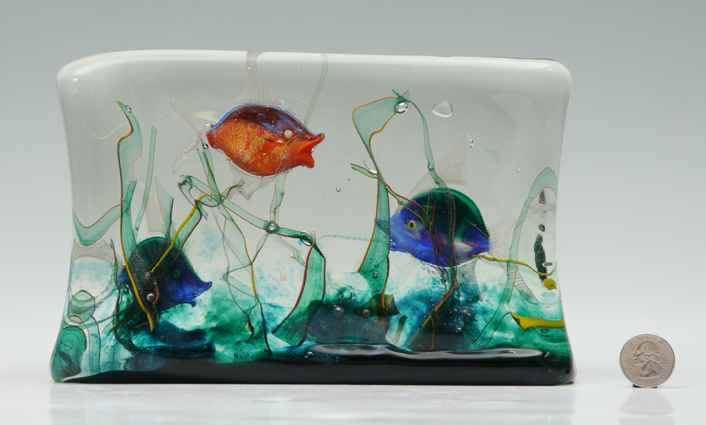 MURANO GLASS FISH AQUARIUM: Glass block with 3 fish, attributed to Gino Cenedese, Murano, unmarked. Measures 5 3/4'' h. x 9 1/4'' x 2 1/2''.