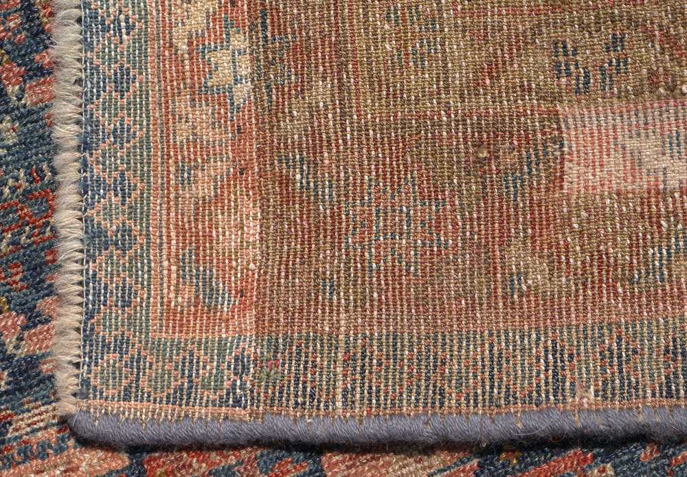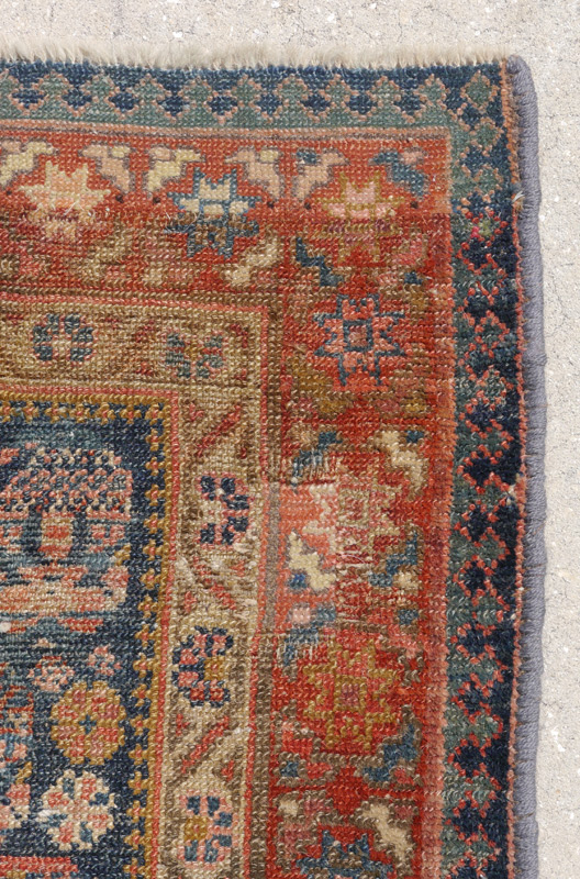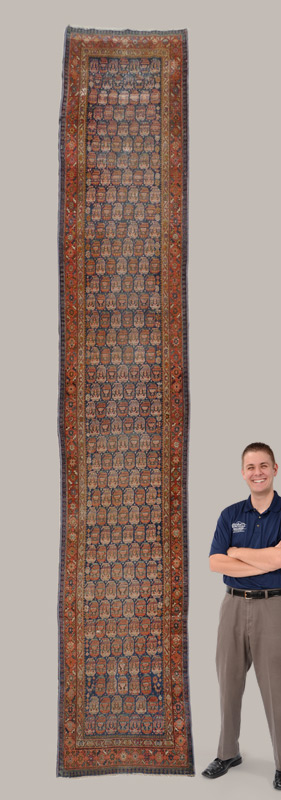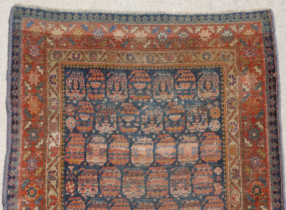 ANTIQUE KURDISH PERSIAN HAND KNOTTED WOOL RUG, 3' x 15' 4'': This runner has a central design of repeating rows of ''botehs'' or paisleys with other smaller design elements thrown in at the edges here and there including some bird figures. The botehs are done in colors of reds, blues, ivories, and rusts and rest on a deep blue field. The borders have the same colors as the botehs. This warm tribal look goes well with many modern styles of decorating.