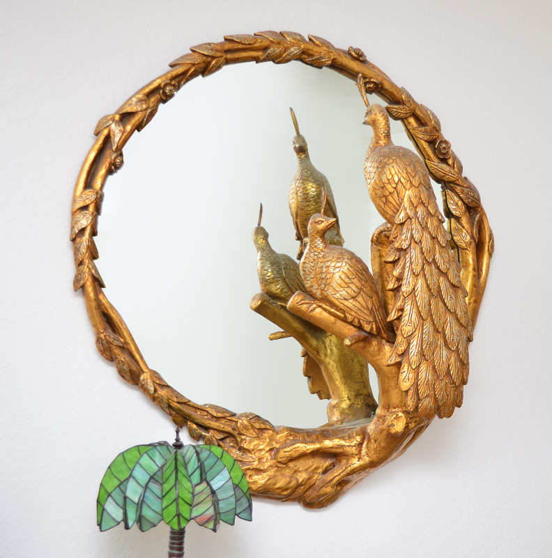 OUTRAGEOUS GILT PEACOCK MIRROR: Silver and gold gilt carved wood mirror with a peacock and peahen. Approx. 48'' dia., allow 15'' depth for the peacock.