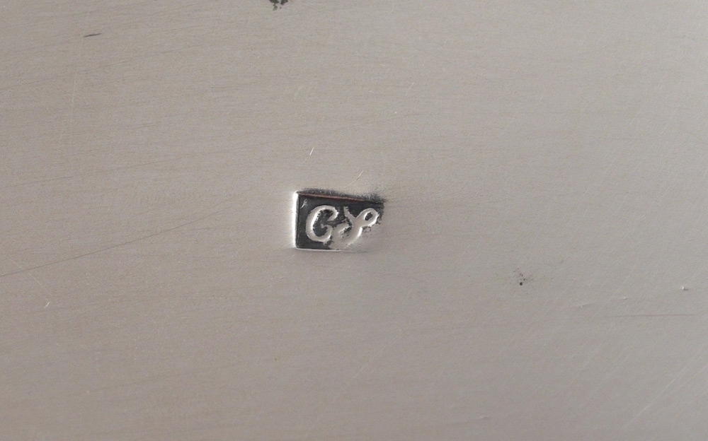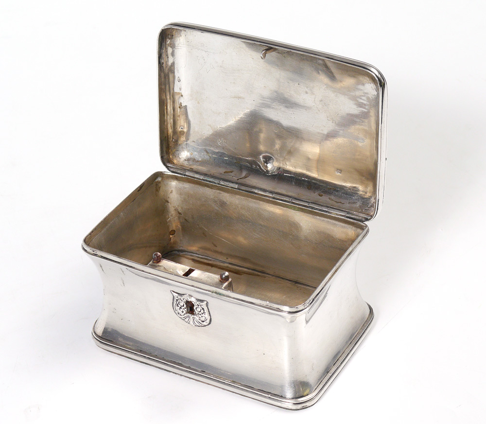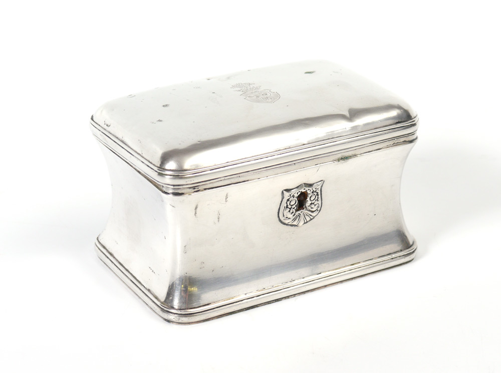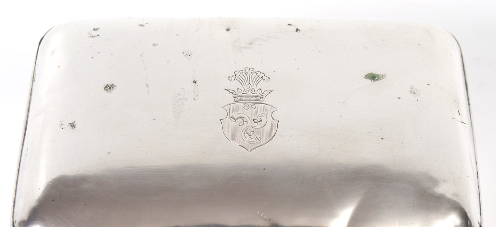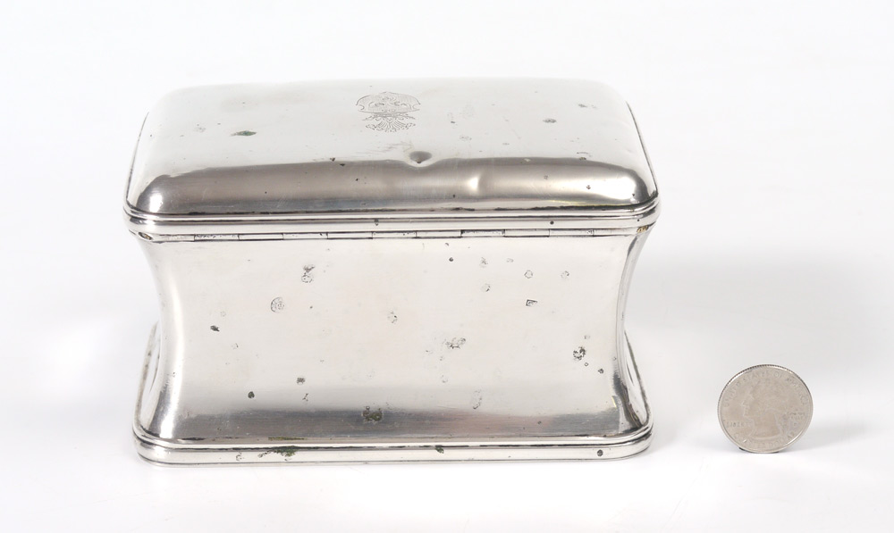 1844 AUSTRIAN SILVER DRESSER BOX: Vienna 1844 13 loth mark, unknown makers mark in script. Hinged lid with engraved armorial crest, lock with no key. Overall measures 3 1/4'' x 5 3/8'' x 3 5/8''. Approx. 13.8 troy oz. Estate of Elton Hoyt II.